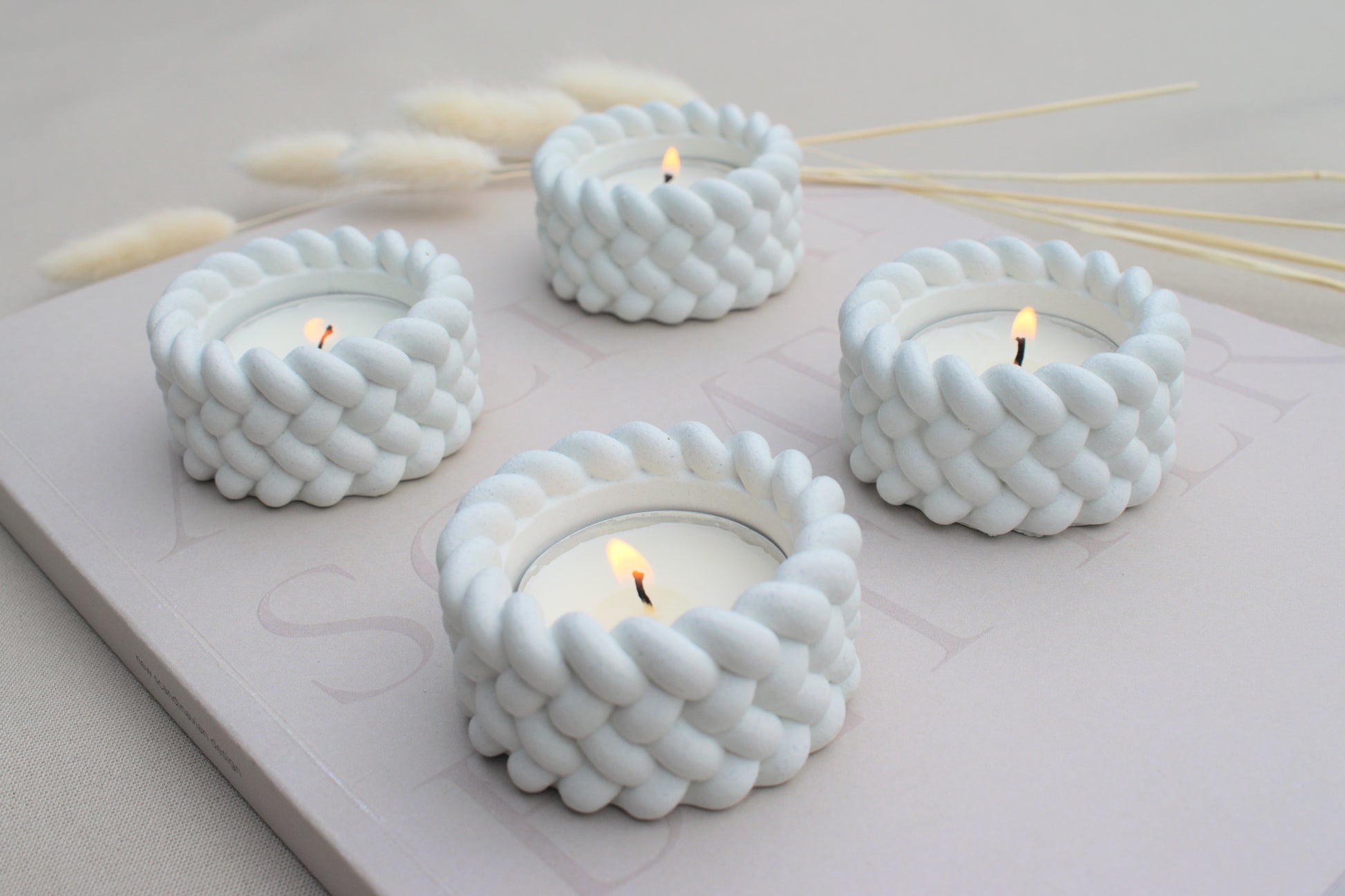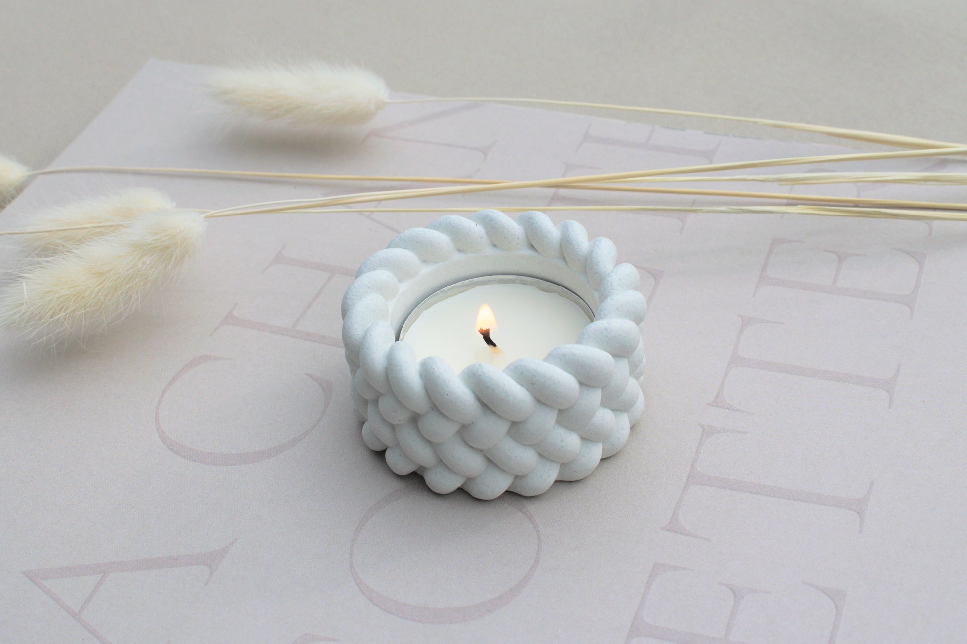 Skandi Teelichthalter/Kerzenhalter im Strickdesign aus weißem Beton.