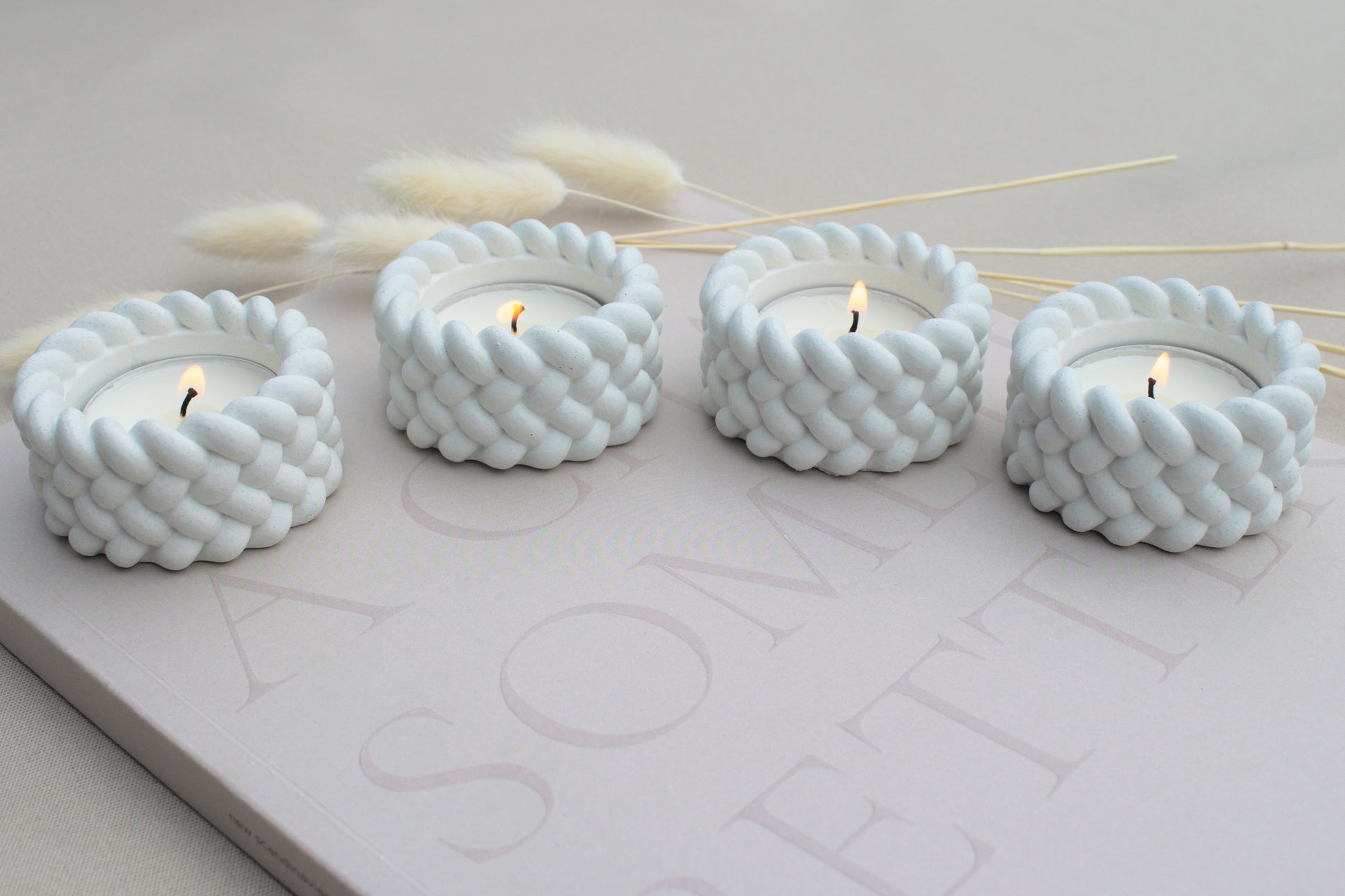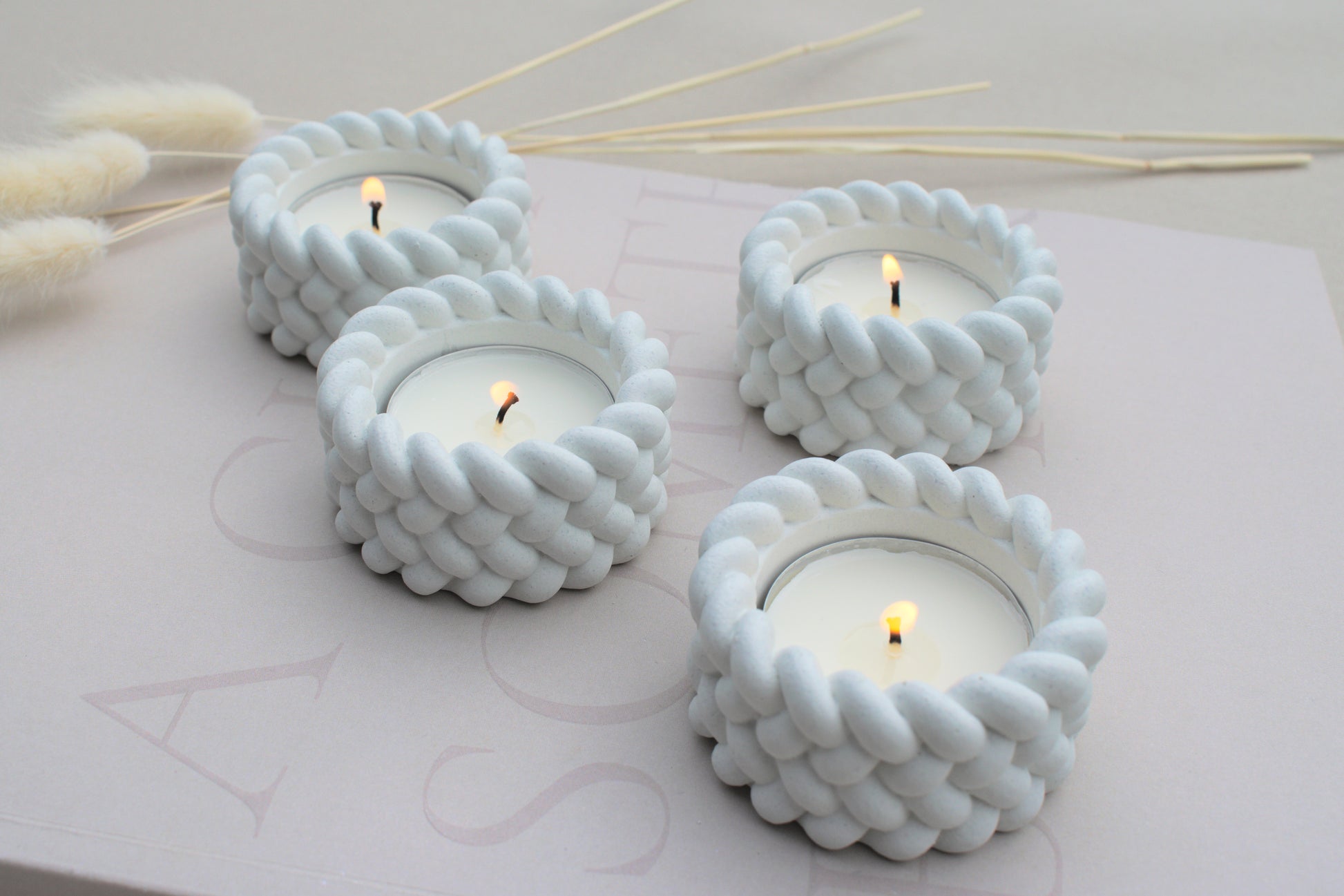 Bringe gemütliche Atmosphäre und modernes Design in dein zu Hause mit diesem handgefertigten Teelichthalter aus hochwertigem, weißem Beton. Die außergewöhnliche Strick- und Flechtoptik verleiht dem robusten Material eine weiche, textile Anmutung und macht jedes Stück zu einem echten Blickfang.