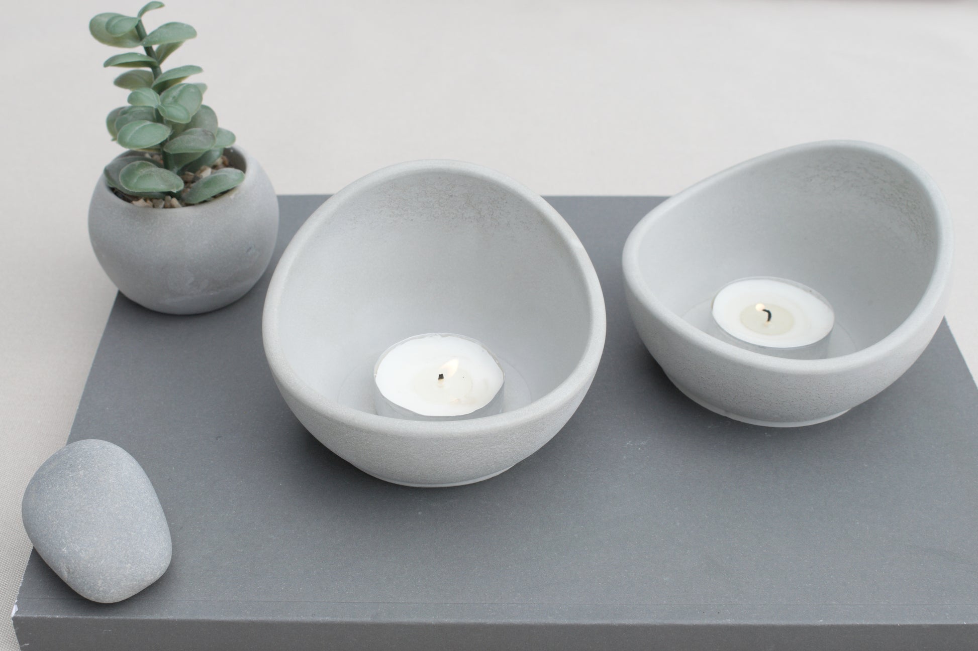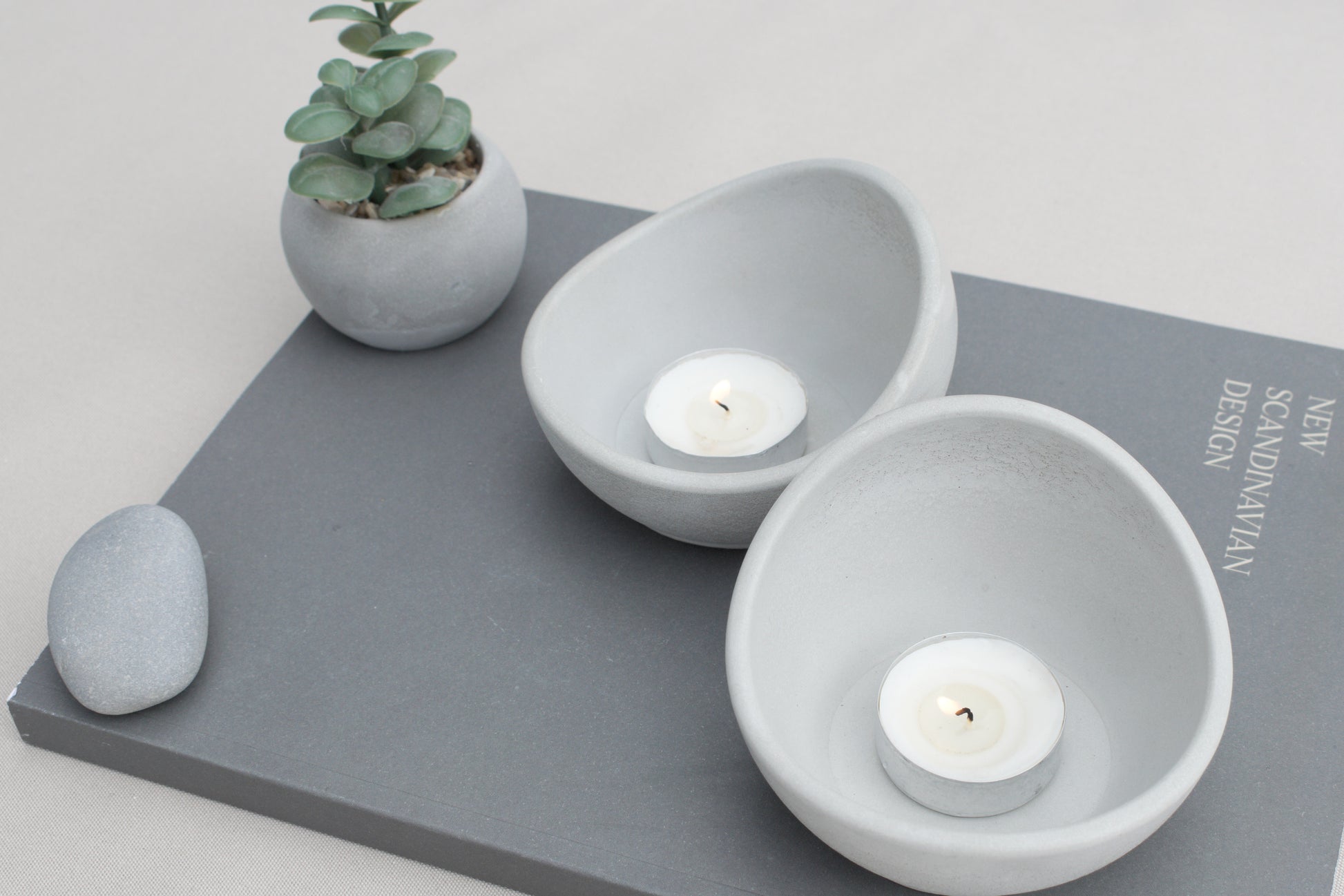 Du erhälst 2 Teelichthalter aus grauem Beton, der Rest der Deko ist nicht in der Bestellung enthalten.