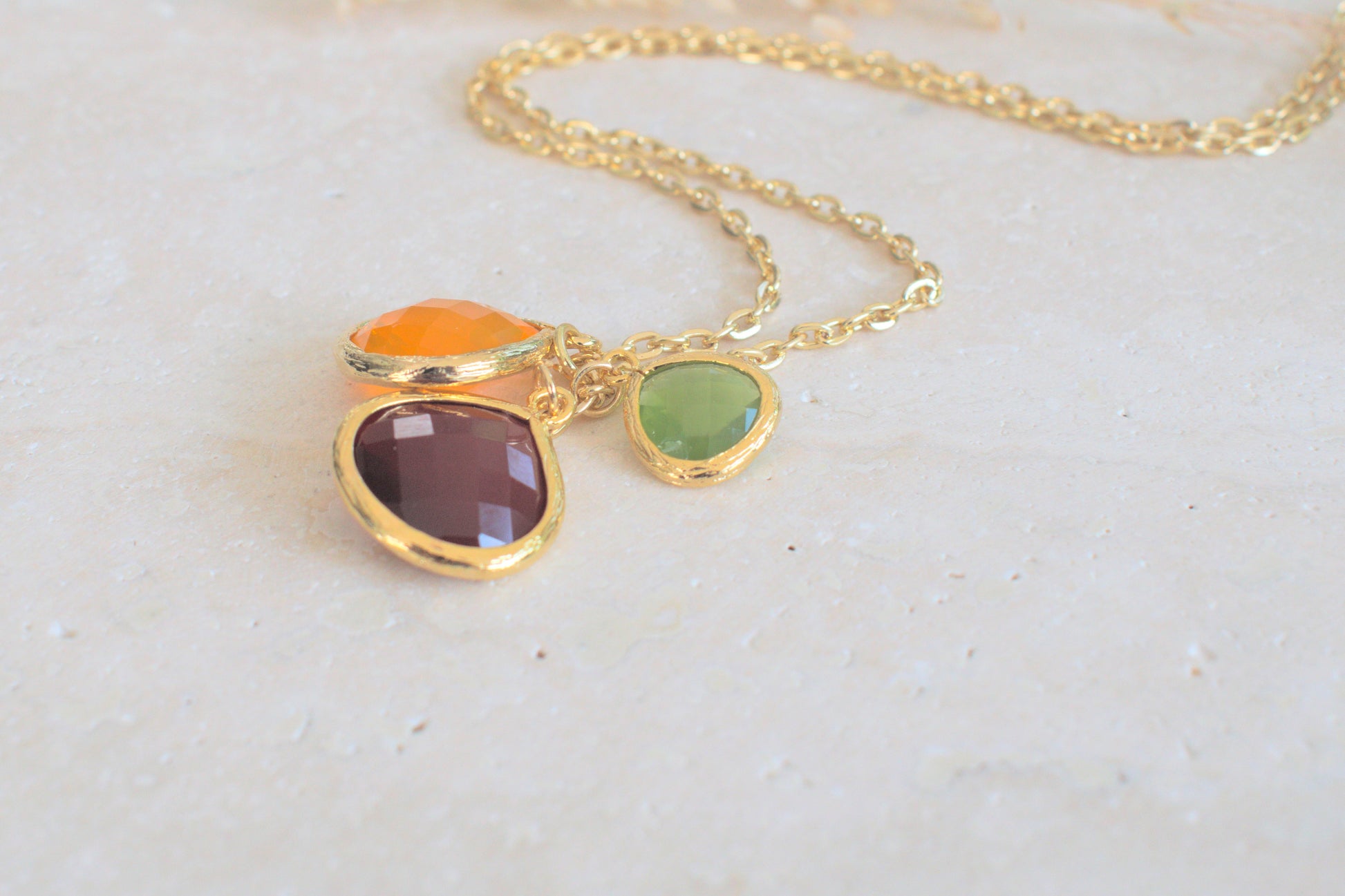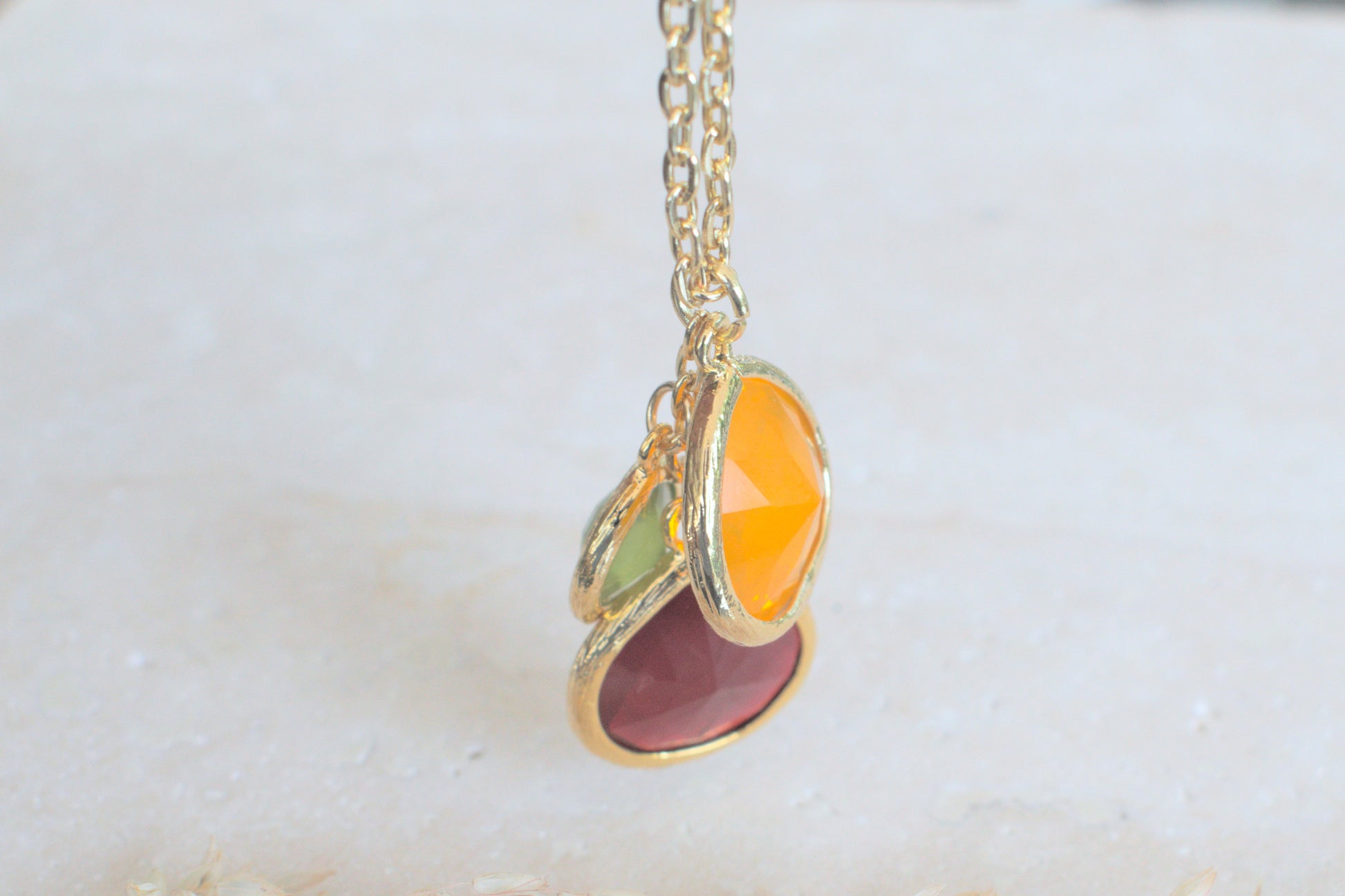 Goldene Kette mit bunten Steinen in verschiedenen Längen grün, orange und schwedenrot