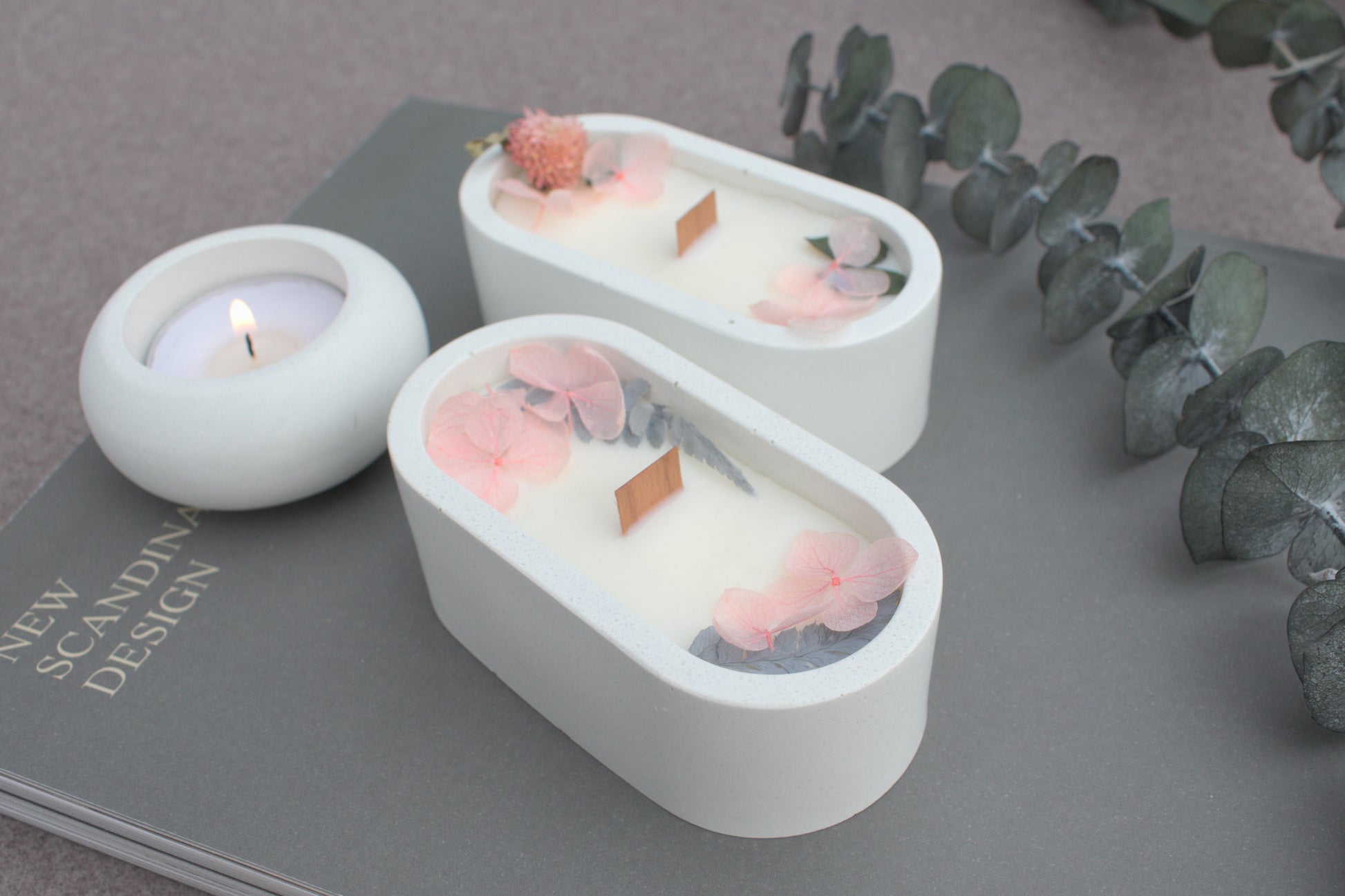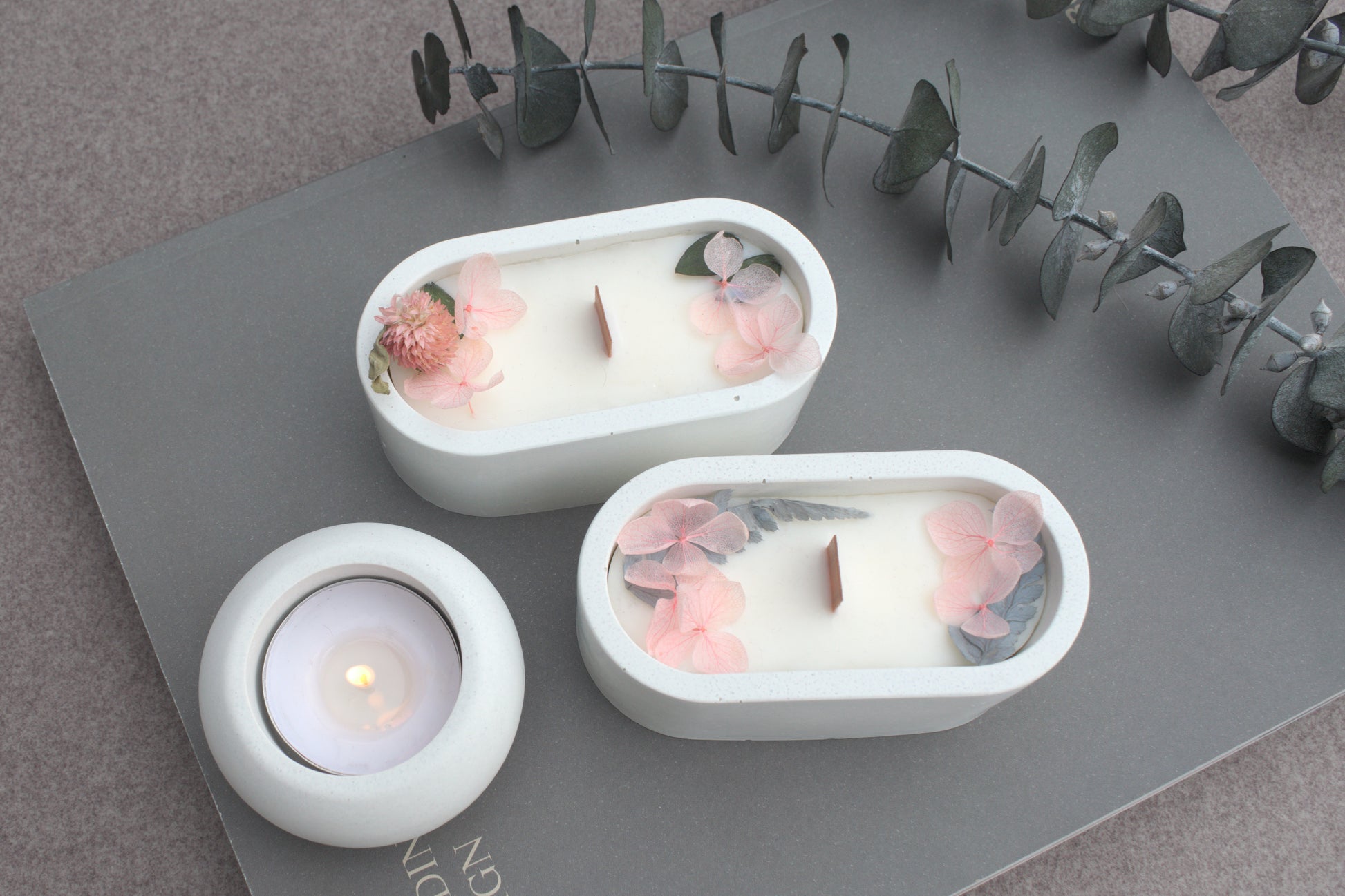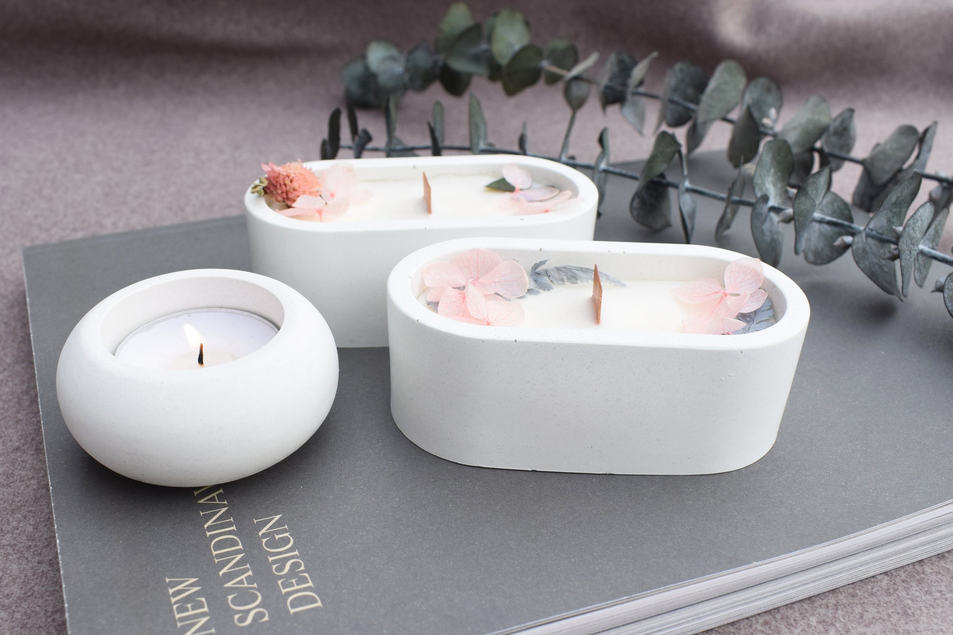 Deko Set aus Beton mit einer Kerze und getrockneten Blüten.