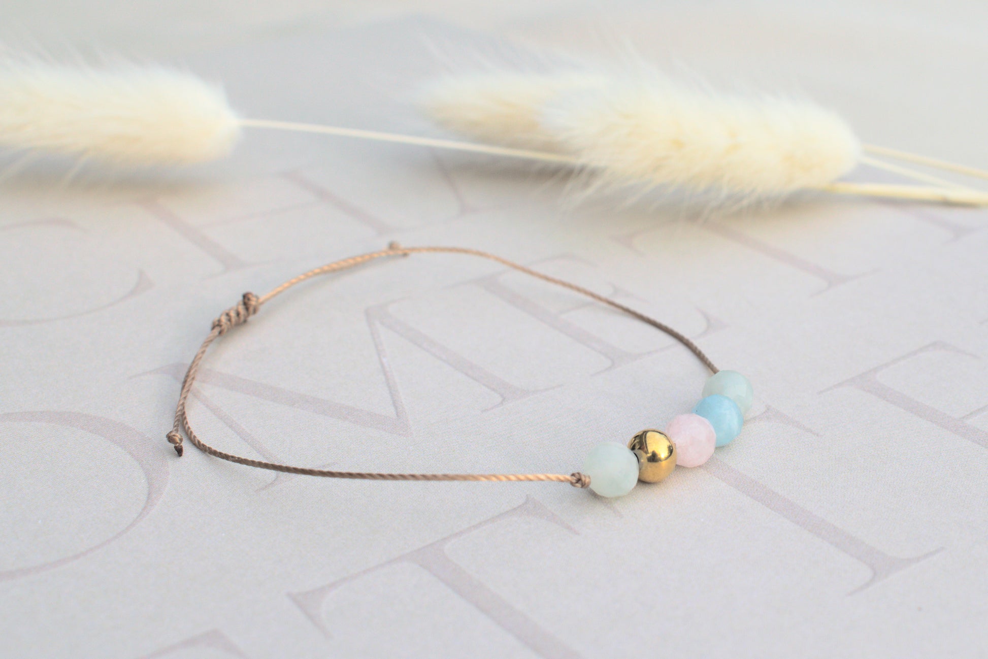 Dieses handgefertigte Freundschaftsarmband vereint schlichte Eleganz mit farbenfroher Leichtigkeit. Das edle braune Nylonband sorgt für angenehmen Tragekomfort und hohe Strapazierfähigkeit, während vier bunten Edelstein-Perlen aus Morganit jedem Stück einen individuellen Charakter verleihen. Eine goldene Edelstahlperle setzt einen edlen Akzent und rundet das harmonische Design stilvoll ab.