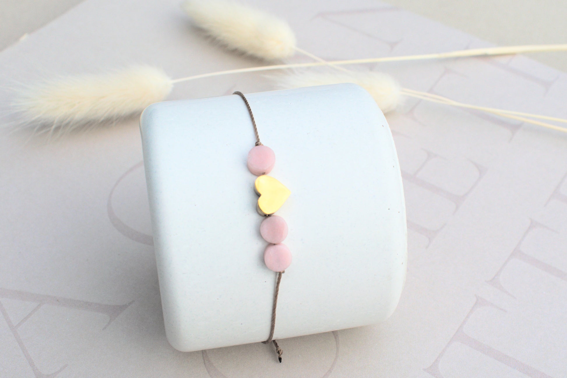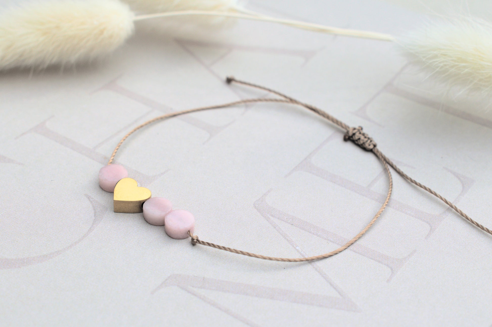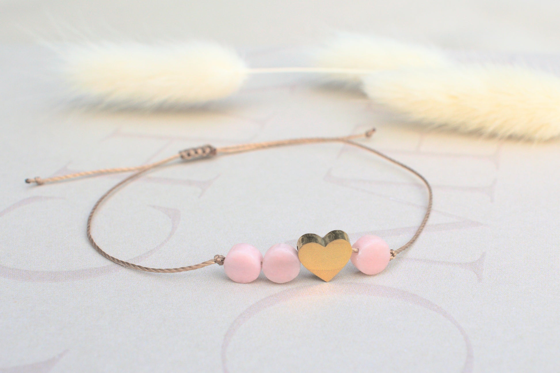 Dieses handgefertigte Freundschaftsarmband vereint schlichte Eleganz mit farbenfroher Leichtigkeit. Das edle braune Nylonband sorgt für angenehmen Tragekomfort und hohe Strapazierfähigkeit, während drei flach geschliffenen Edelstein-Perlen aus rosa Opalen jedem Stück einen individuellen Charakter verleihen. Eine goldene Edelstahlperle in Form eines Herzens setzt einen edlen Akzent und rundet das harmonische Design stilvoll ab.