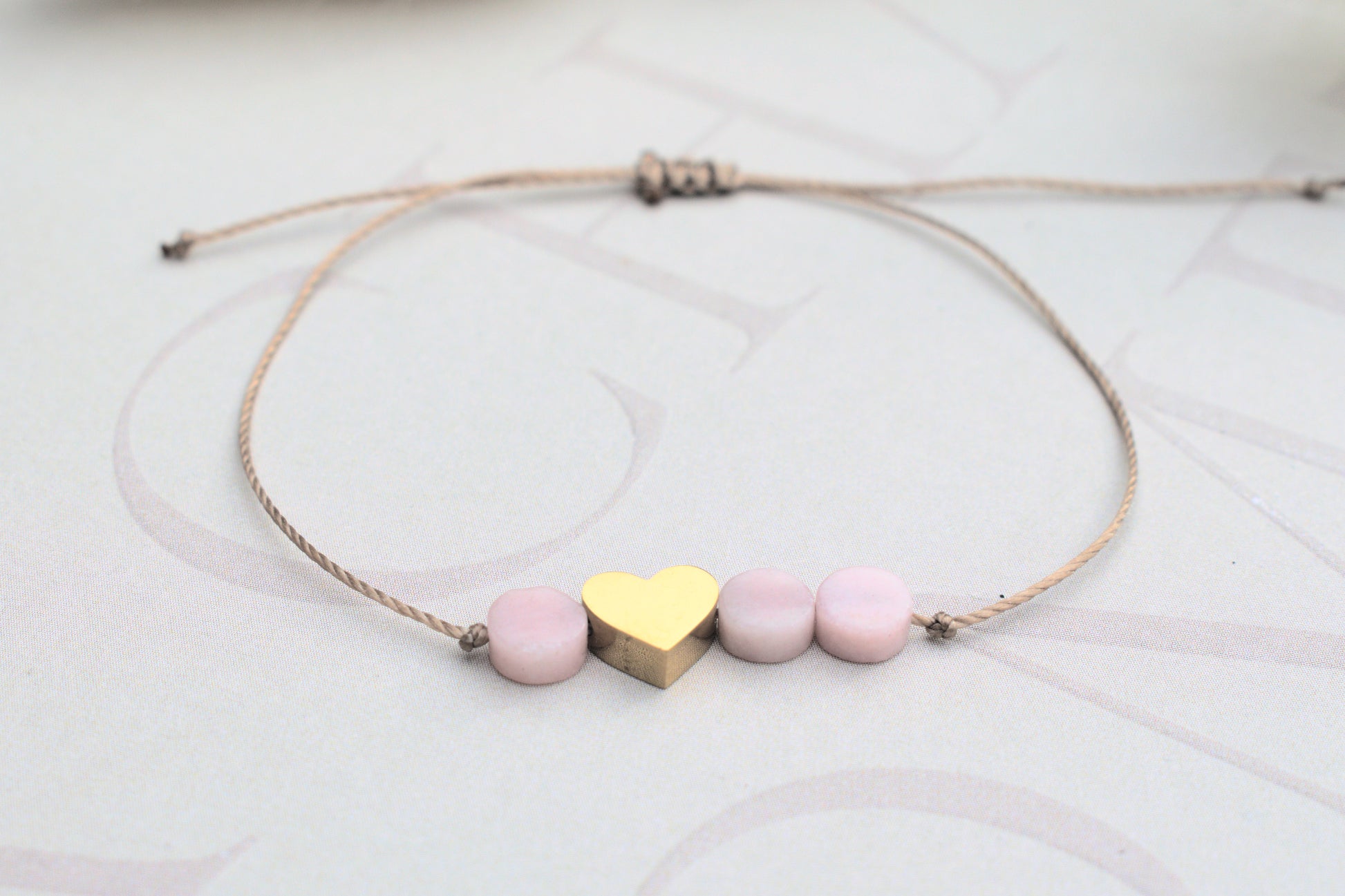 Freundschaftsarmband mit einem goldenen flachen Herz und drei kleinen rosa Opal Edelsteinen flach geschliffen