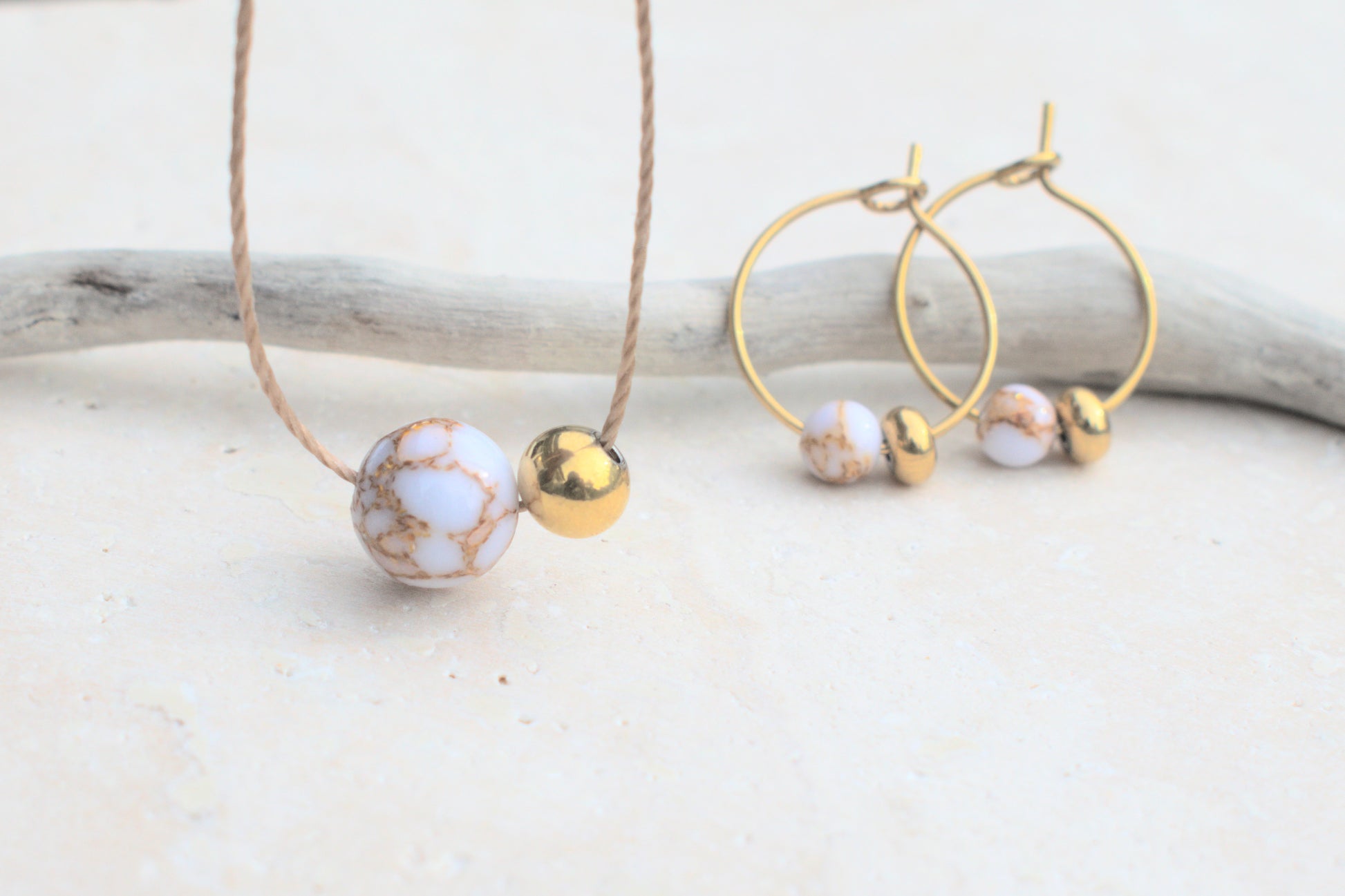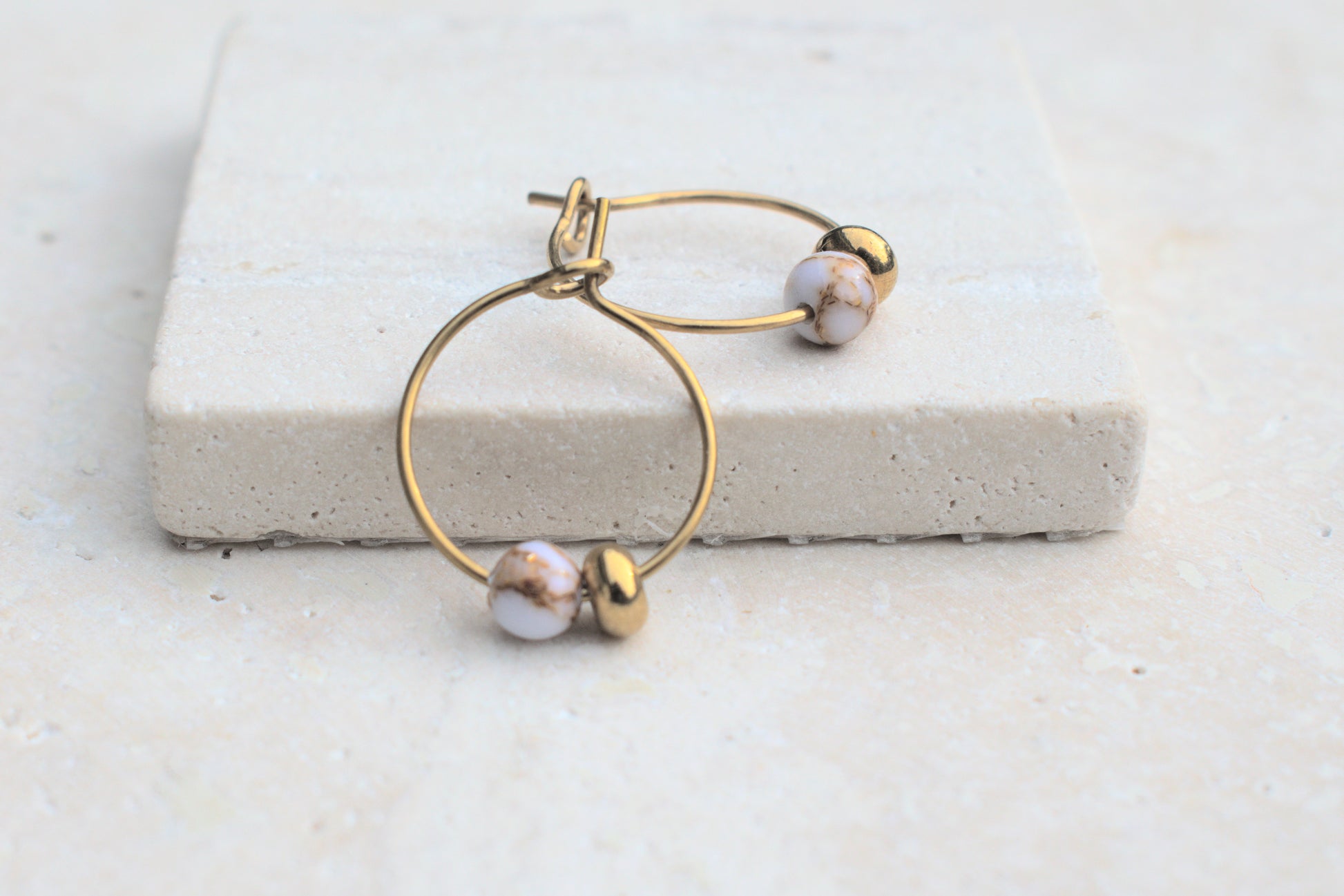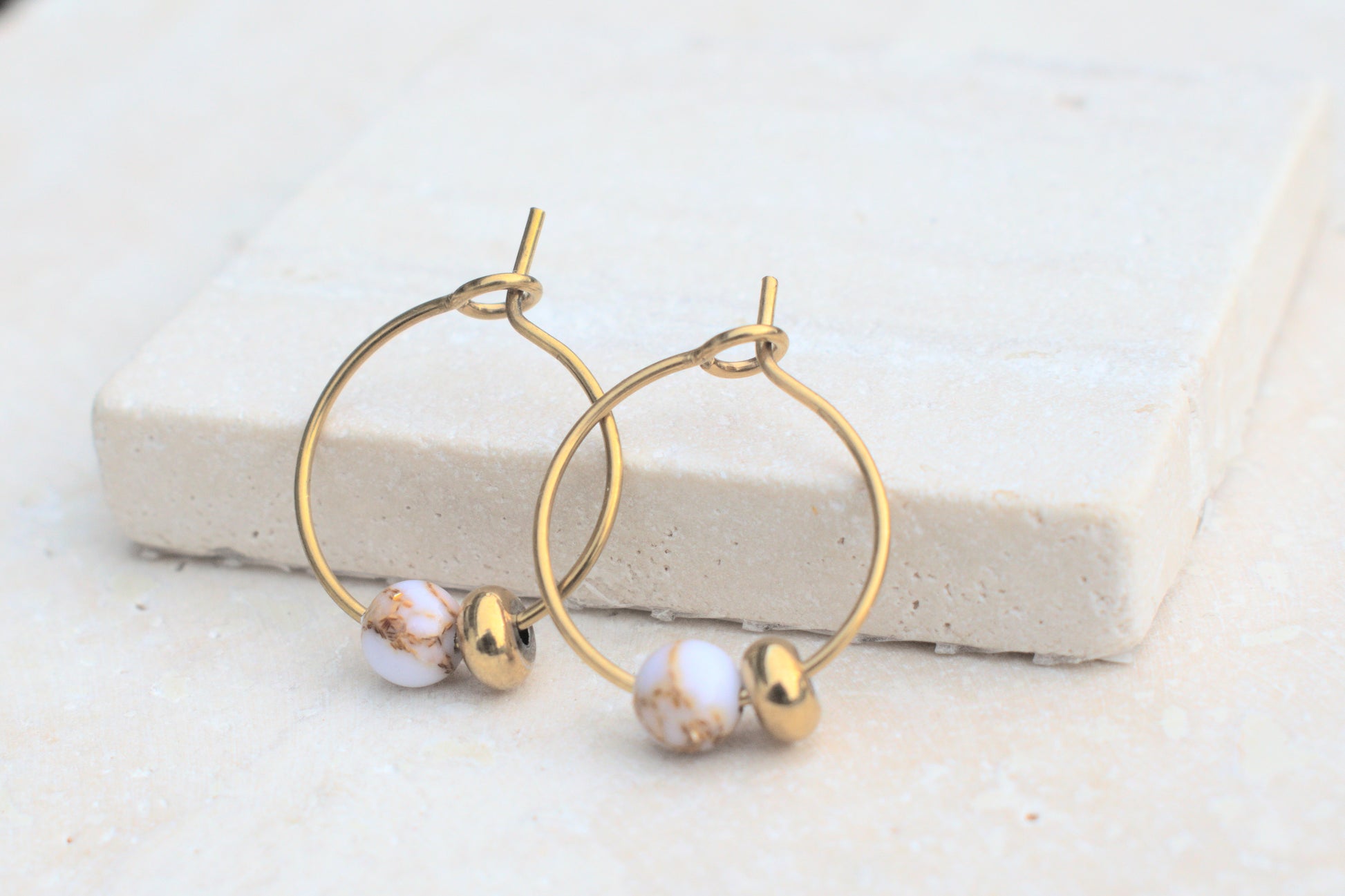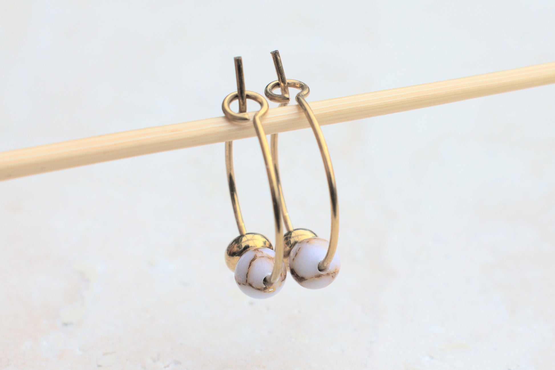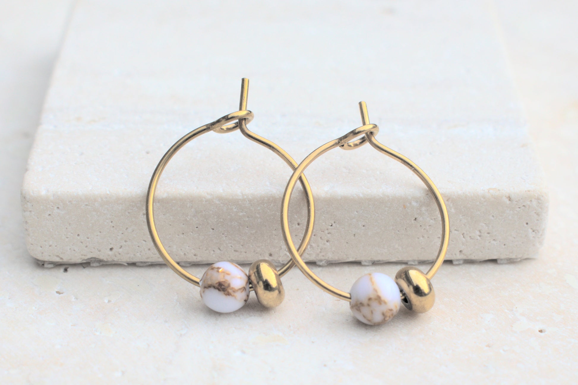 Goldene Creolen Ohrringe mit Howlit Edelstein Perlen in Marmoroptik