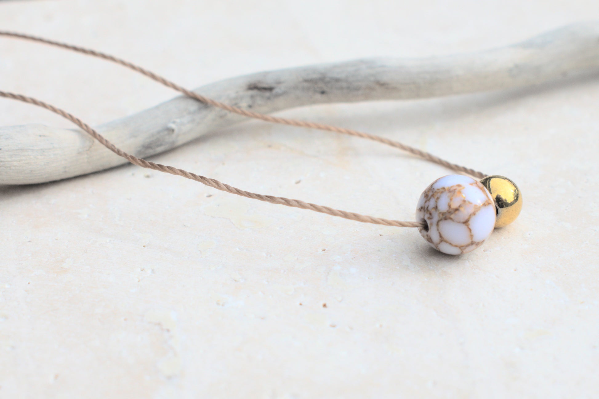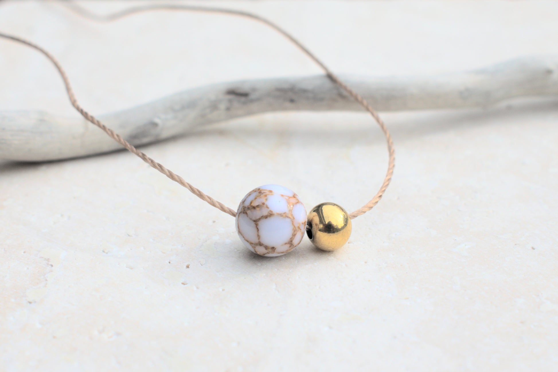 Halskette aus Nylon mit weiß goldenen Howlit Edelstein Perlen in Marmoroptik