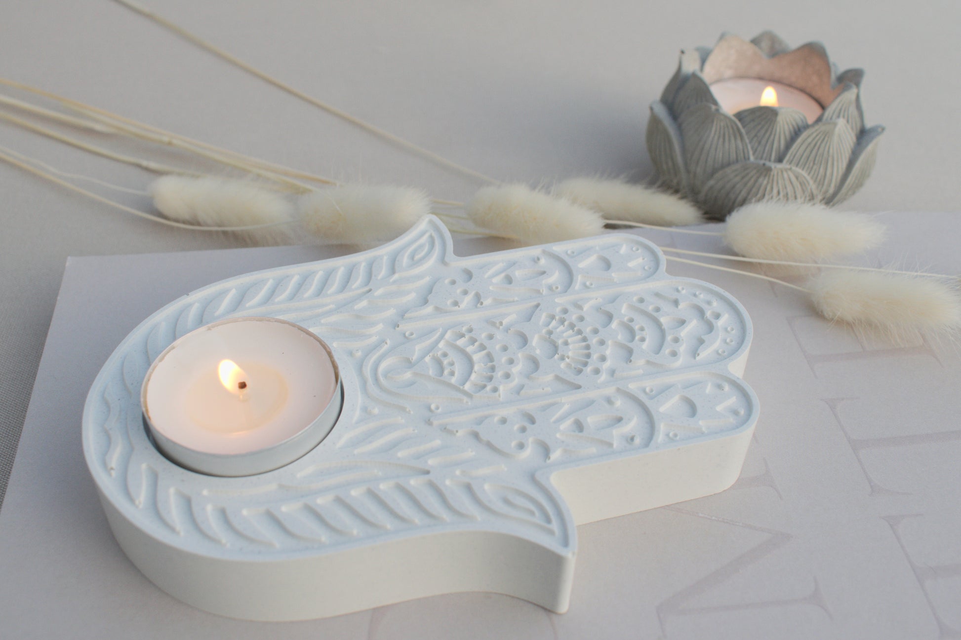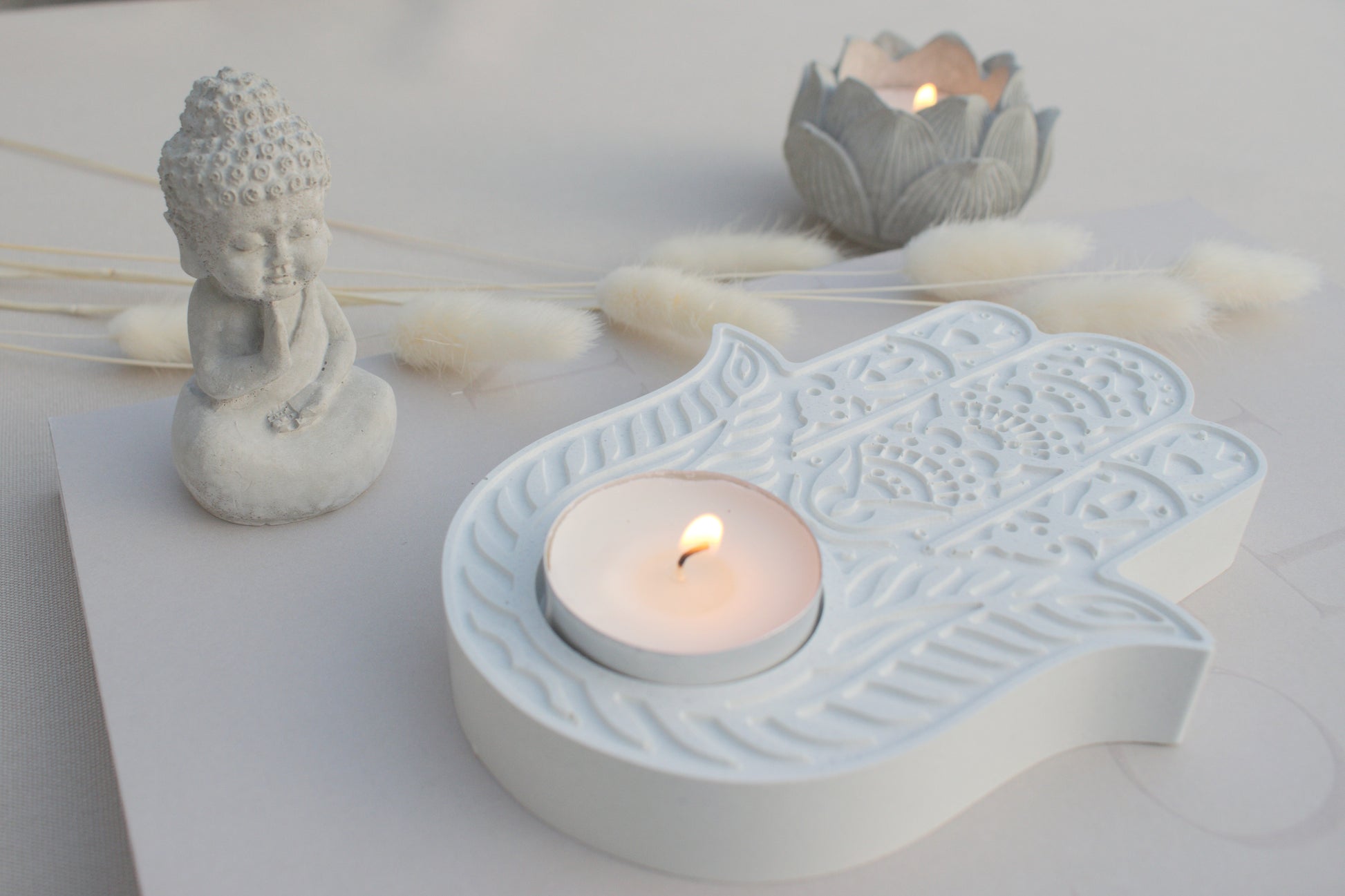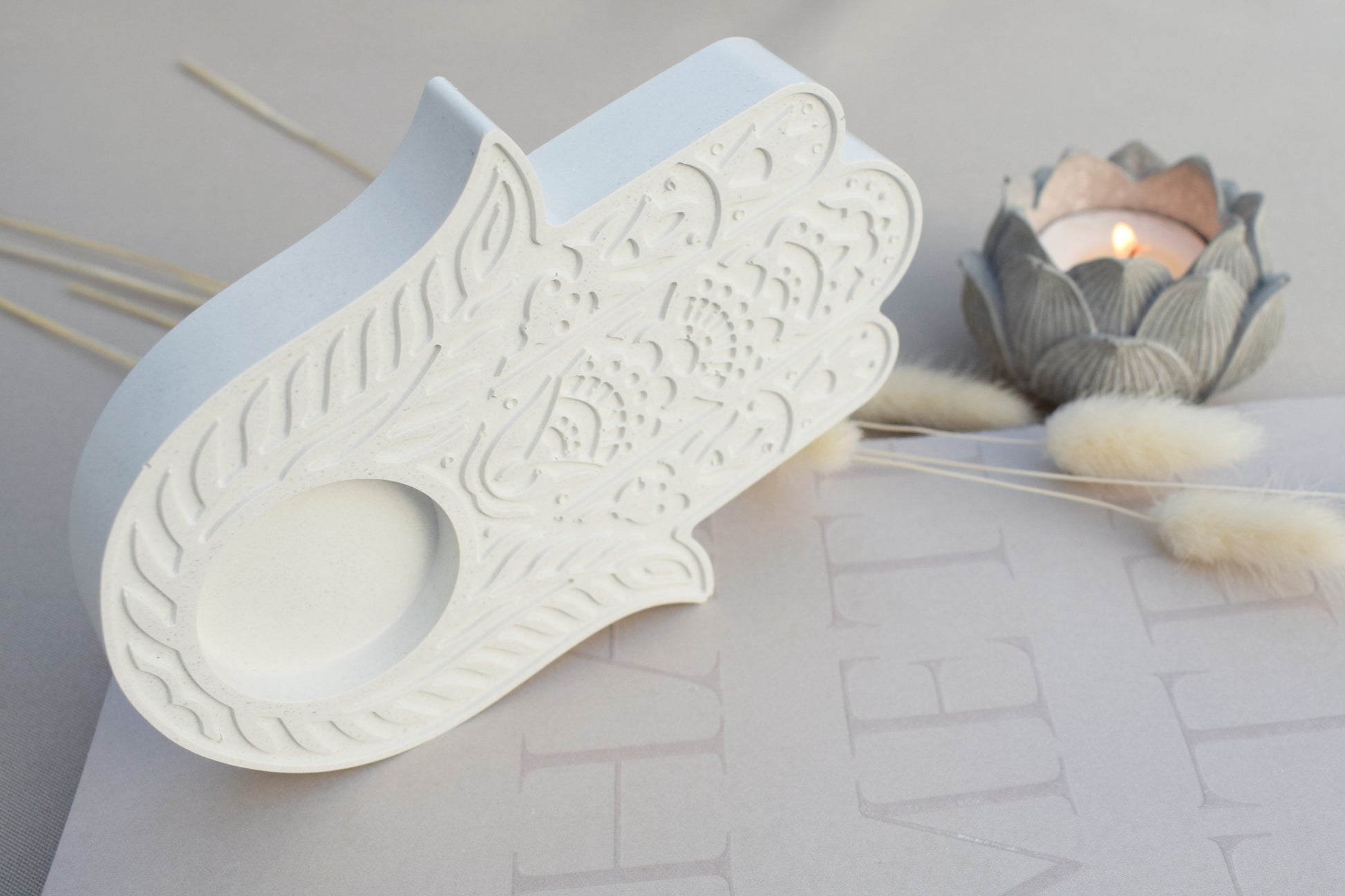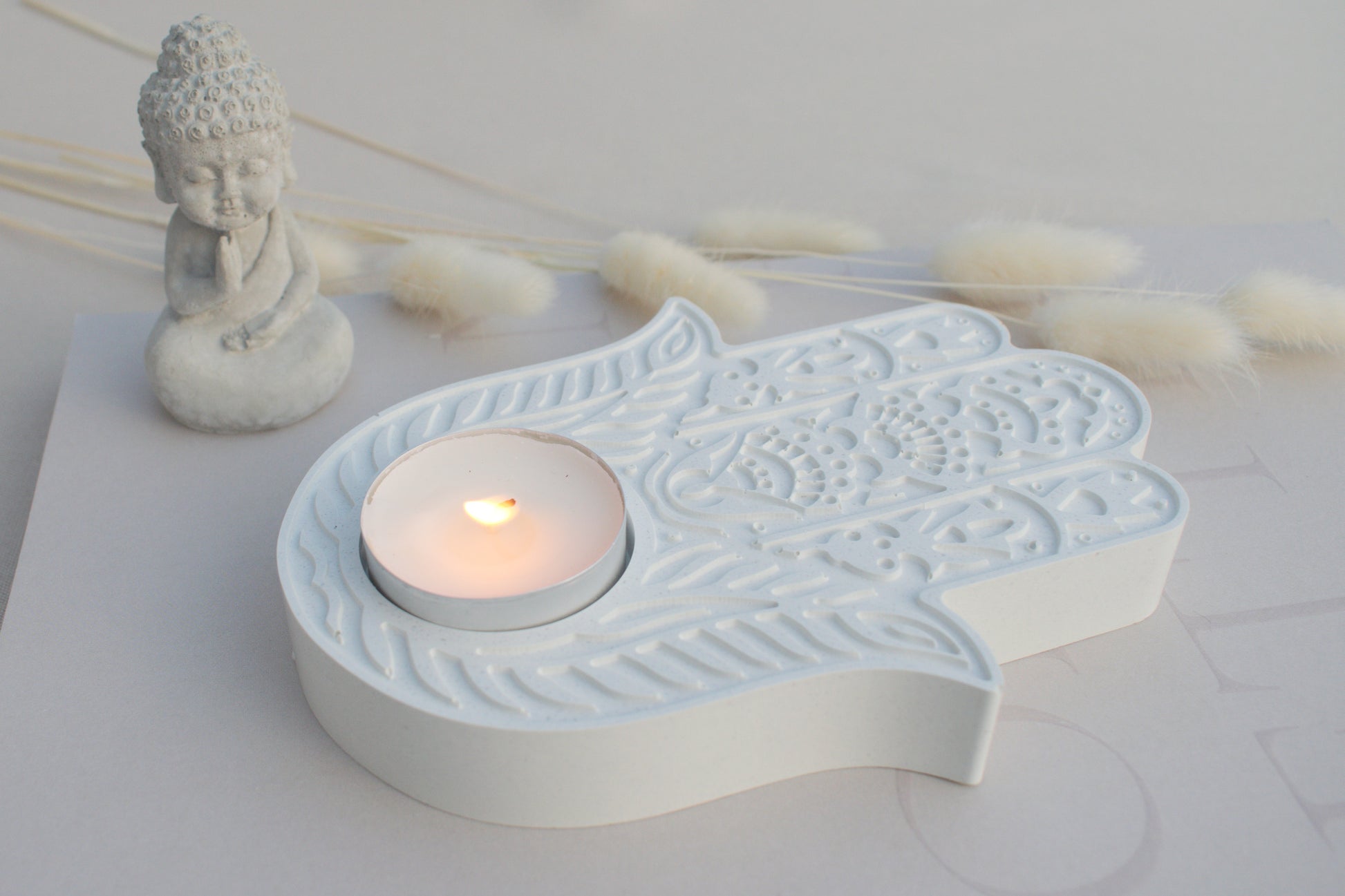 Dieser liebevoll gefertigte Teelichthalter in Form der Hamsa Hand besteht aus hochwertigem, weißem Beton und vereint spirituelle Symbolik mit modernem Minimalismus.