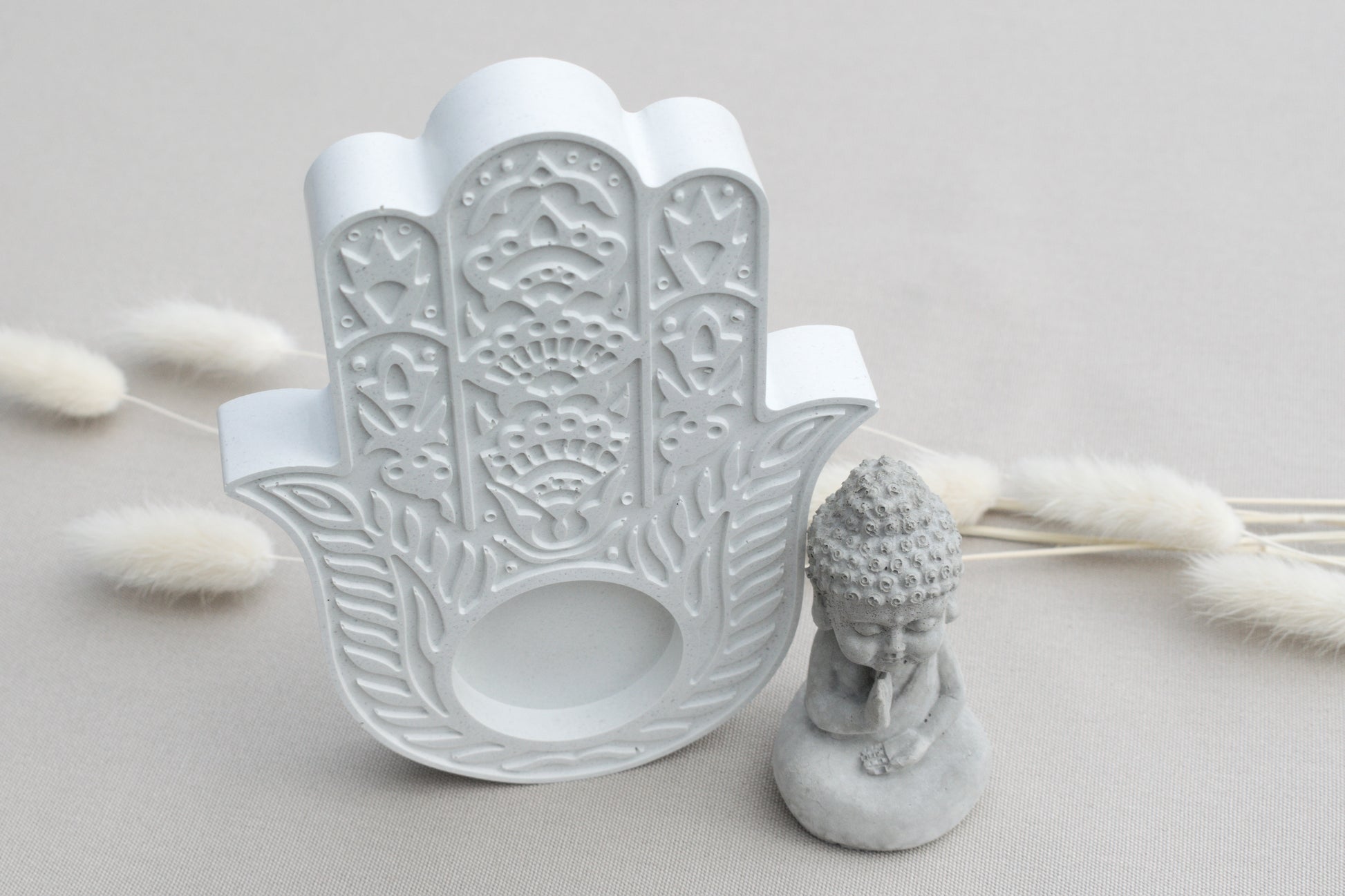 Hamsa Hand Teelichthalter aus weißem Beton als Schutzsymbol
