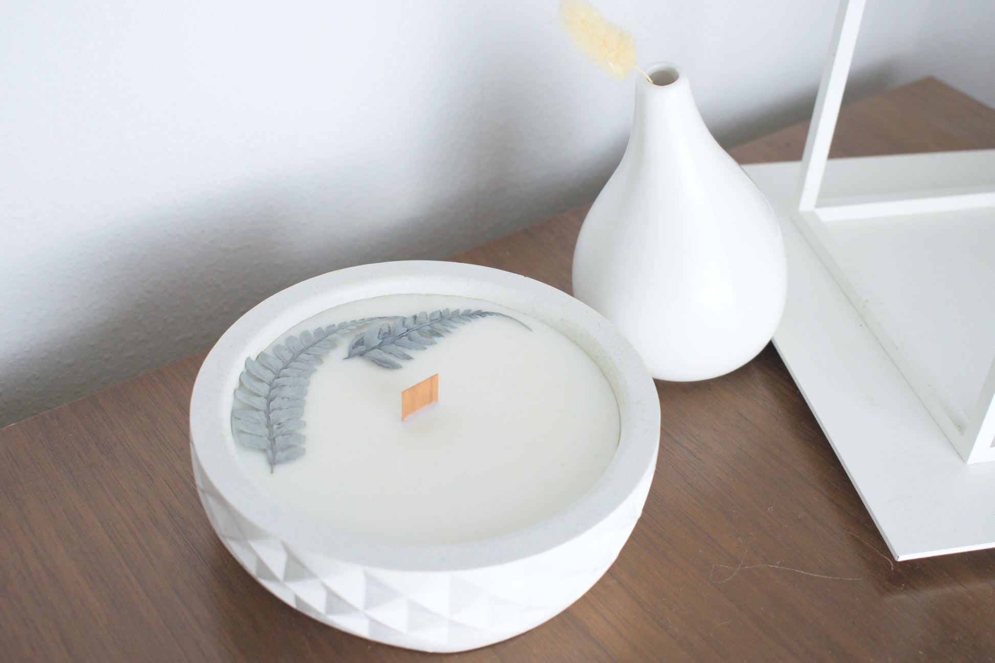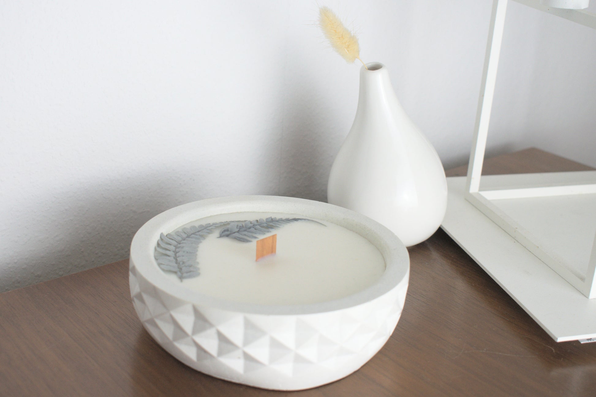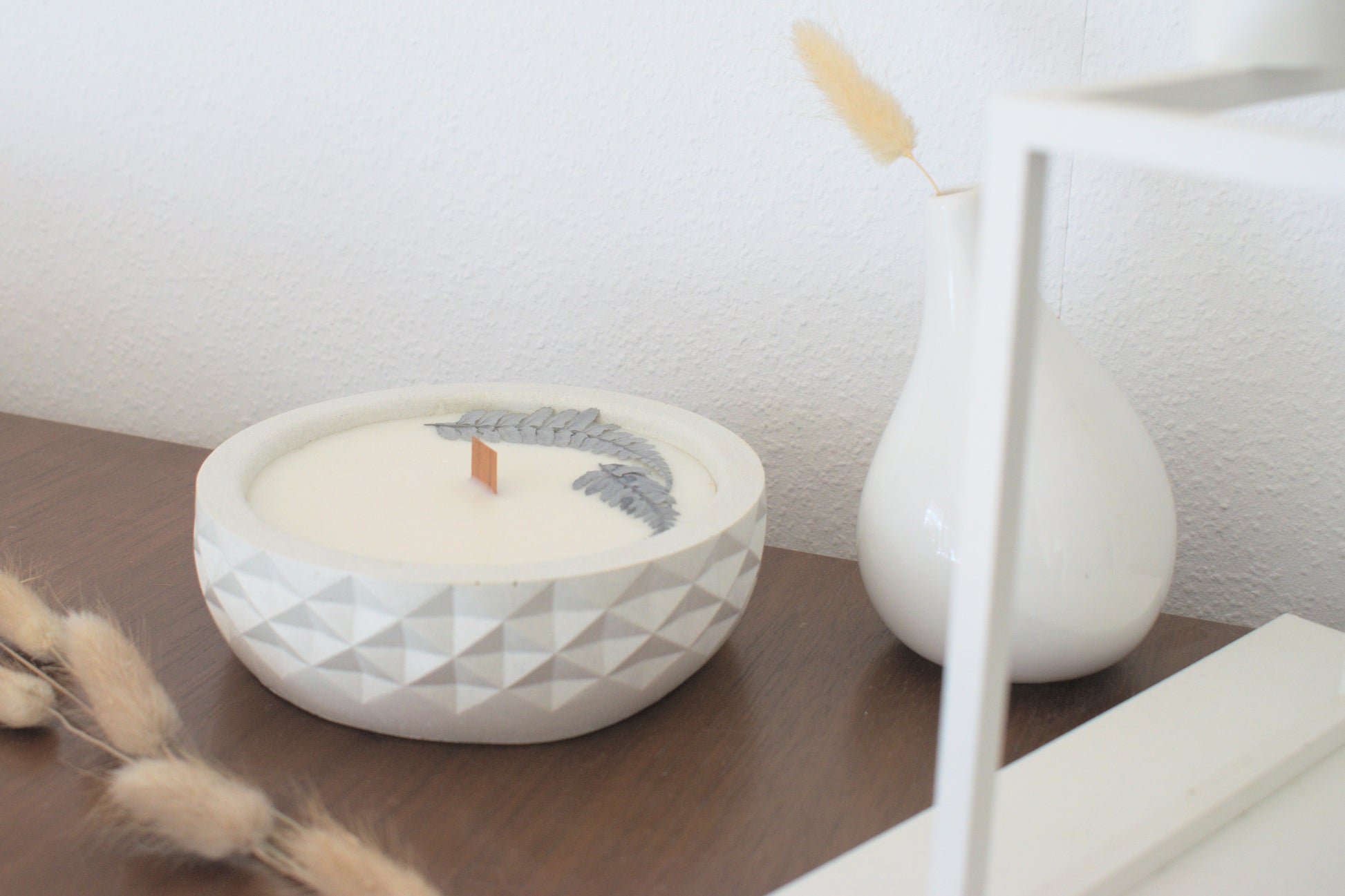 Handgemachte vegane Kerze, Duftkerze mit getrockneten Blüten, Holzdochtkerze, Soyakerze, Kerze mit Beton, handgegossene Kerze
