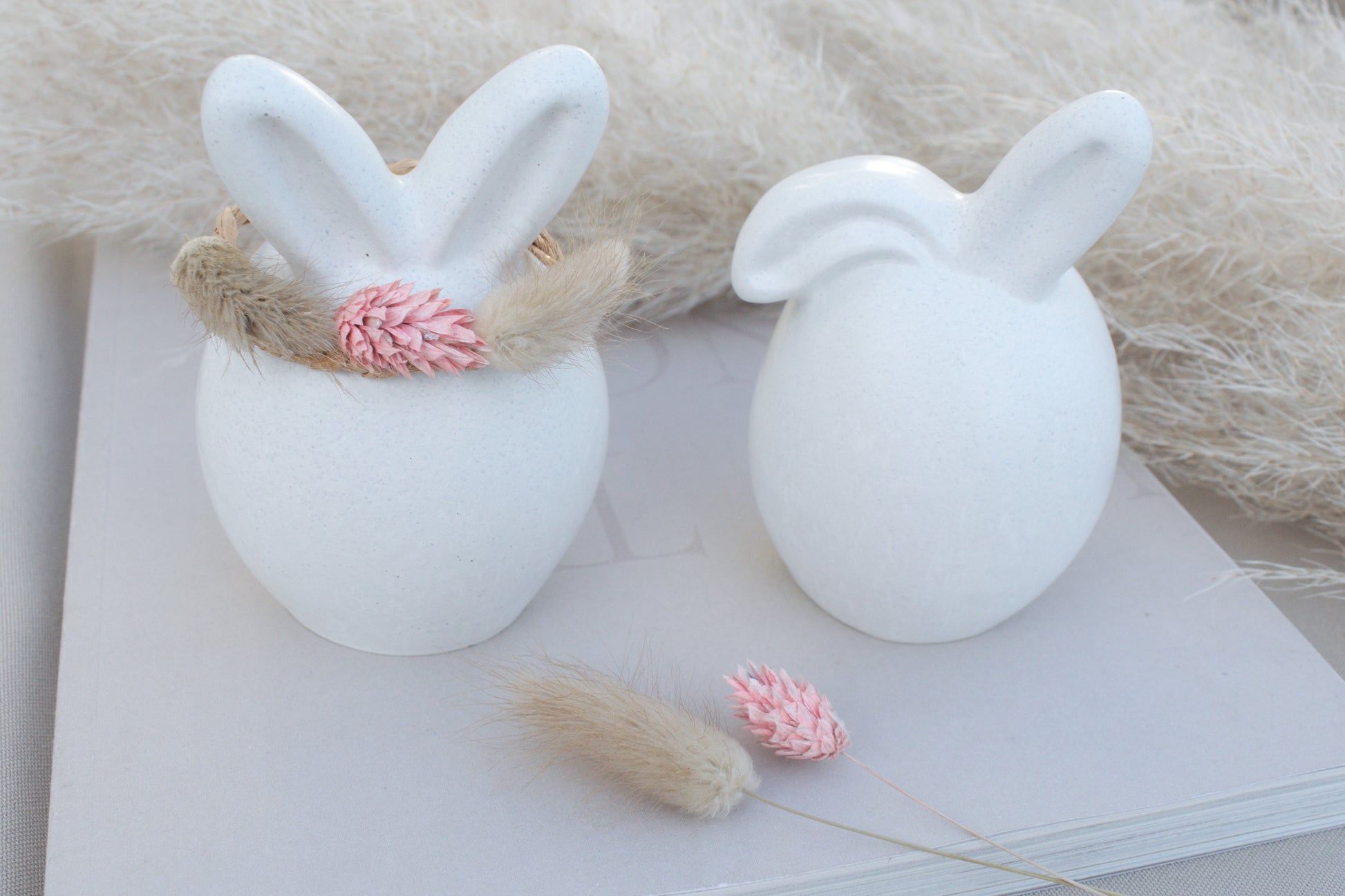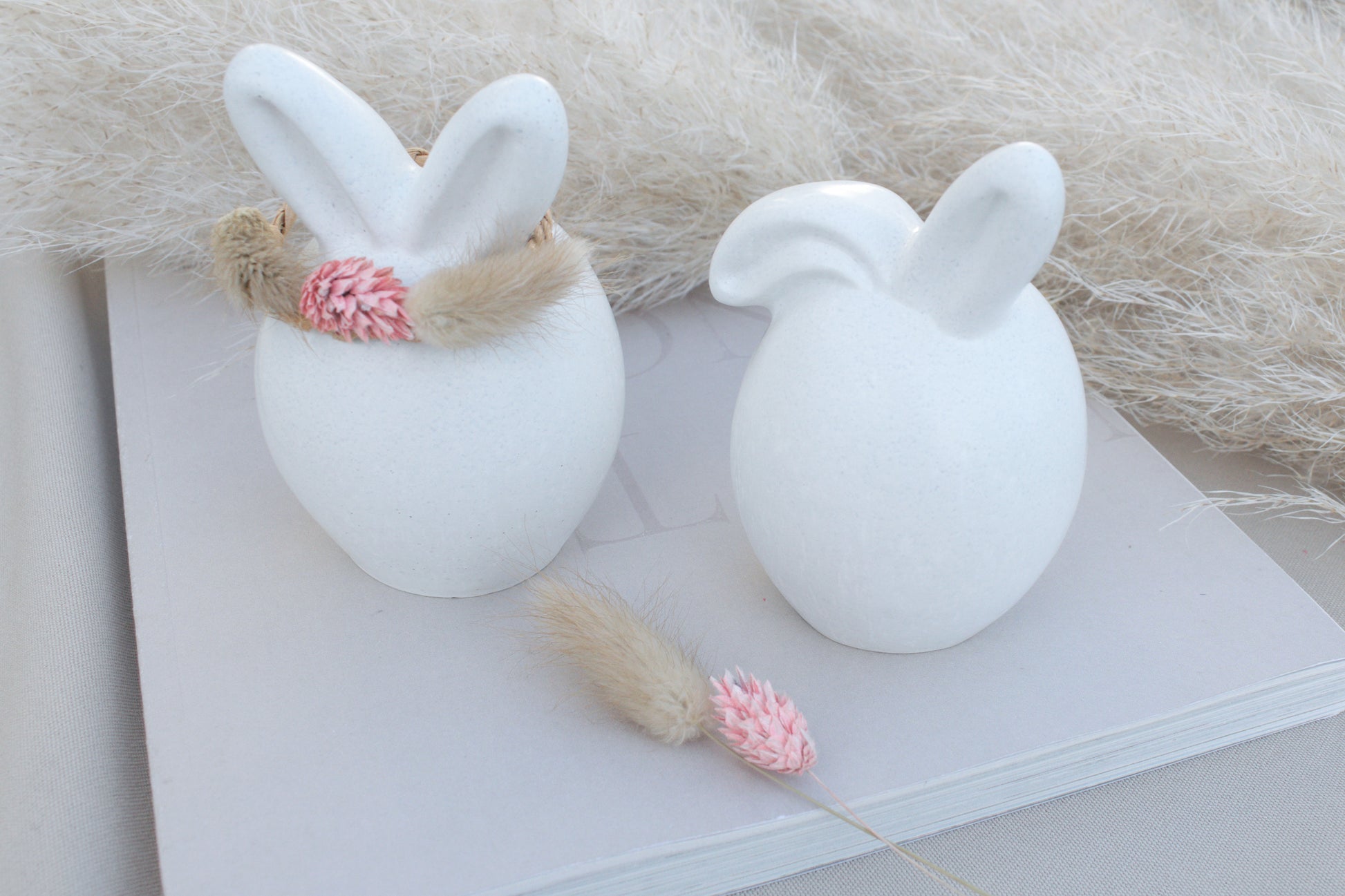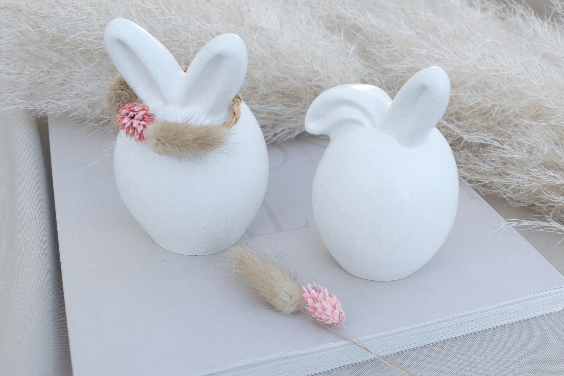Der zweite Hase trägt einen geflochtenen, hellbraunen Drahtring um die Ohren, dekoriert mit drei getrockneten Blüten – ein wunderschöner, natürlicher Akzent im angesagten Skandi-Stil.