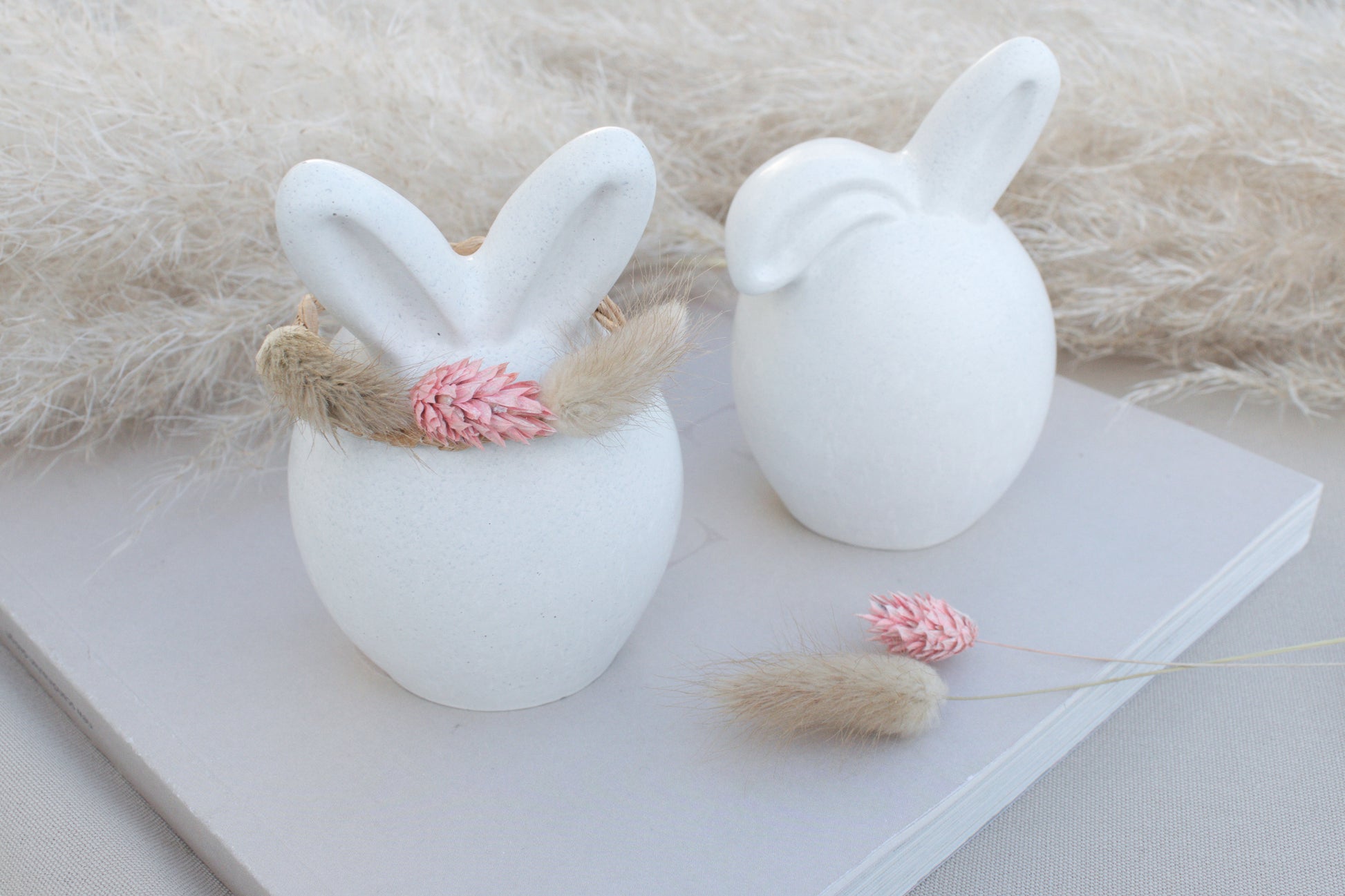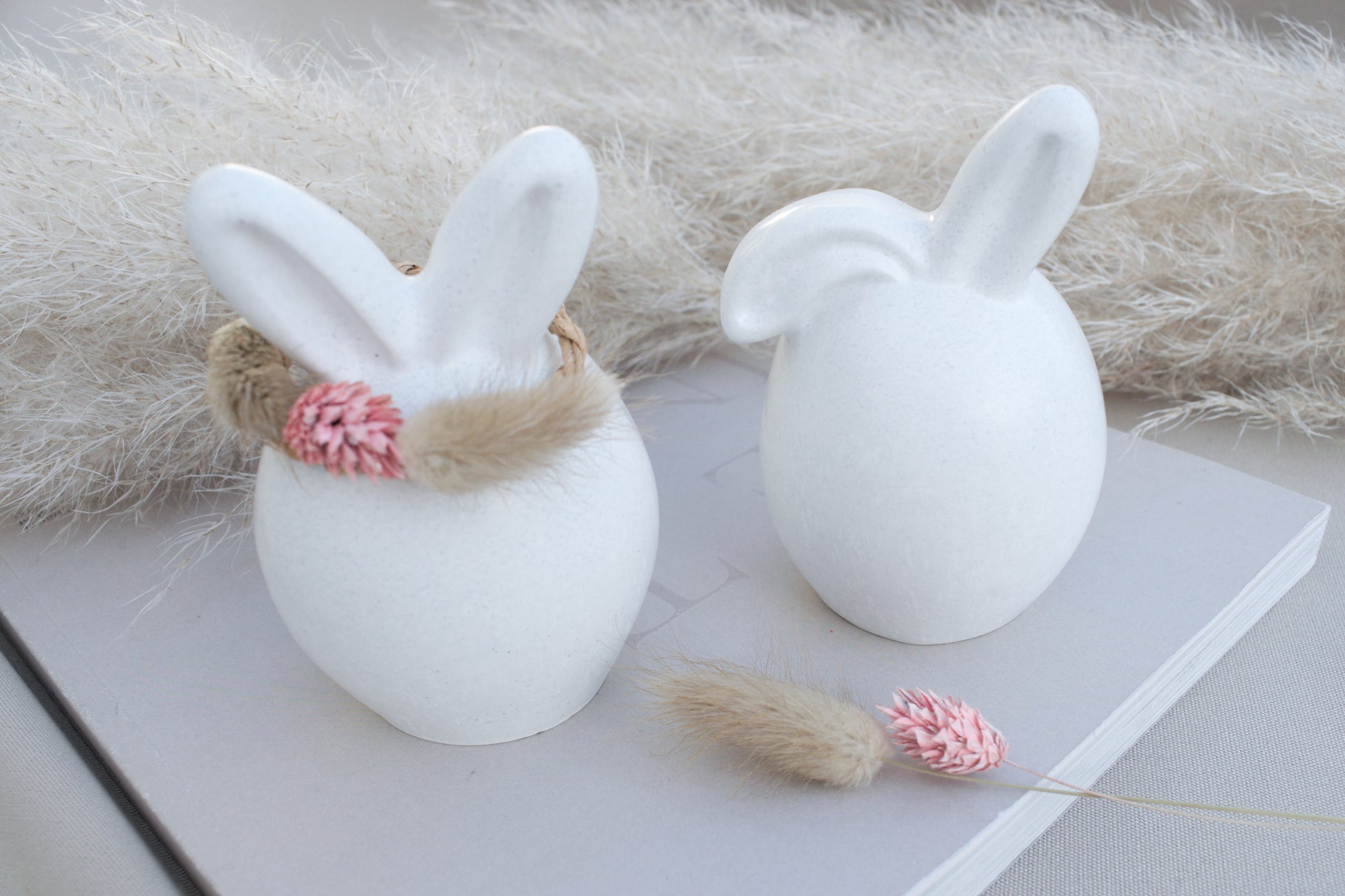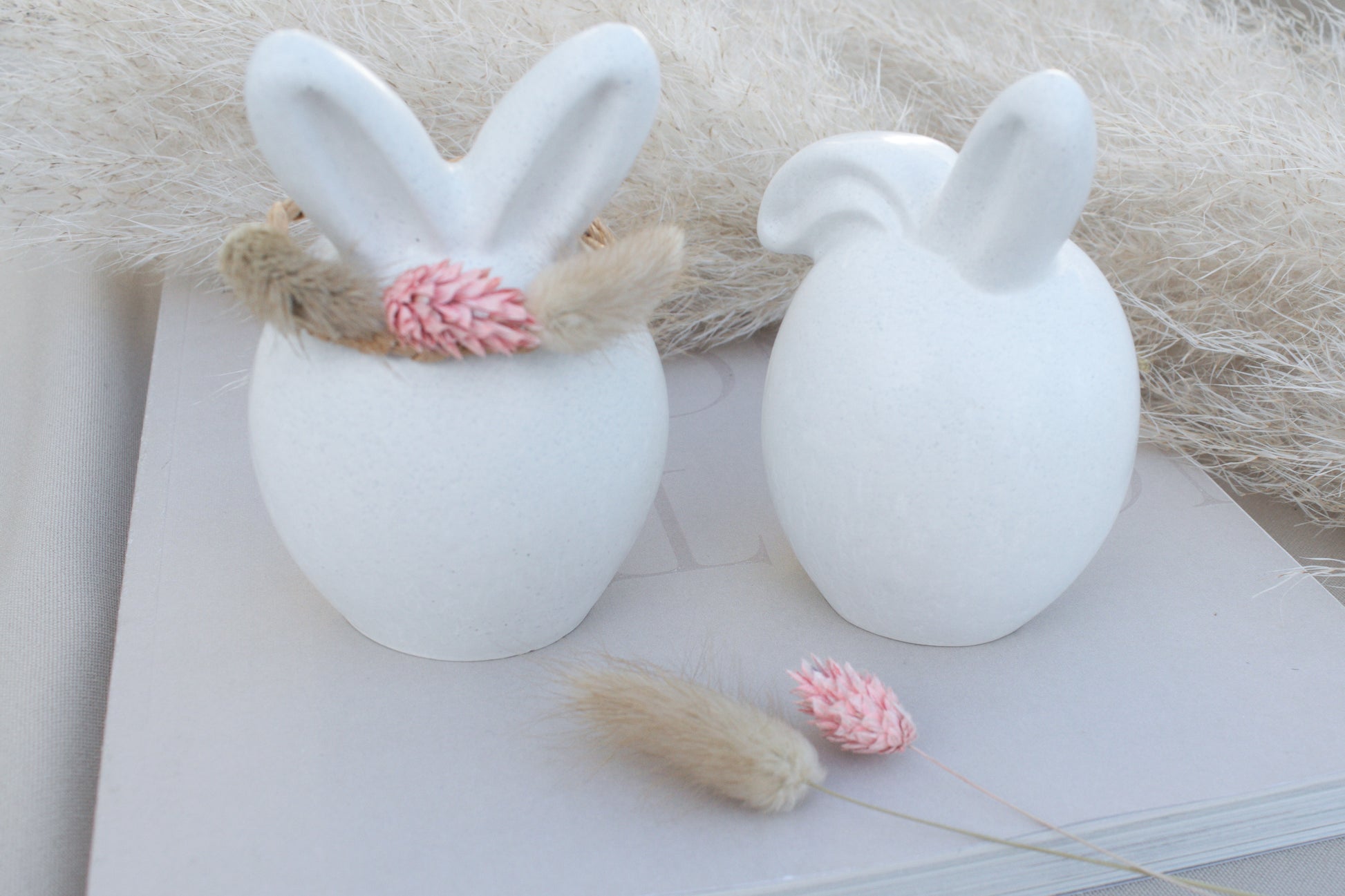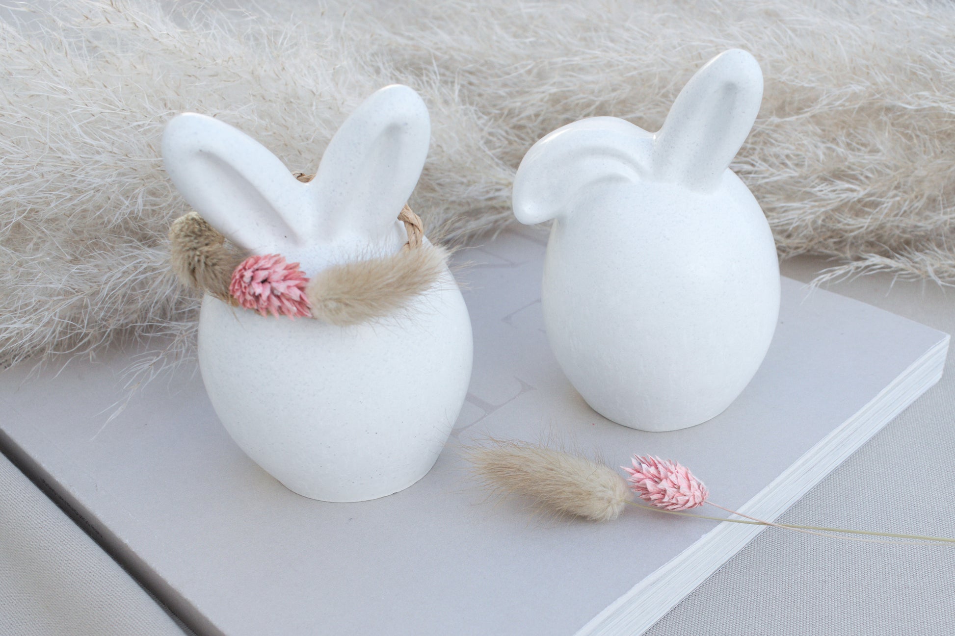 Der zweite Hase trägt einen geflochtenen, hellbraunen Drahtring um die Ohren, dekoriert mit drei getrockneten Blüten – ein wunderschöner, natürlicher Akzent im angesagten Skandi-Stil.