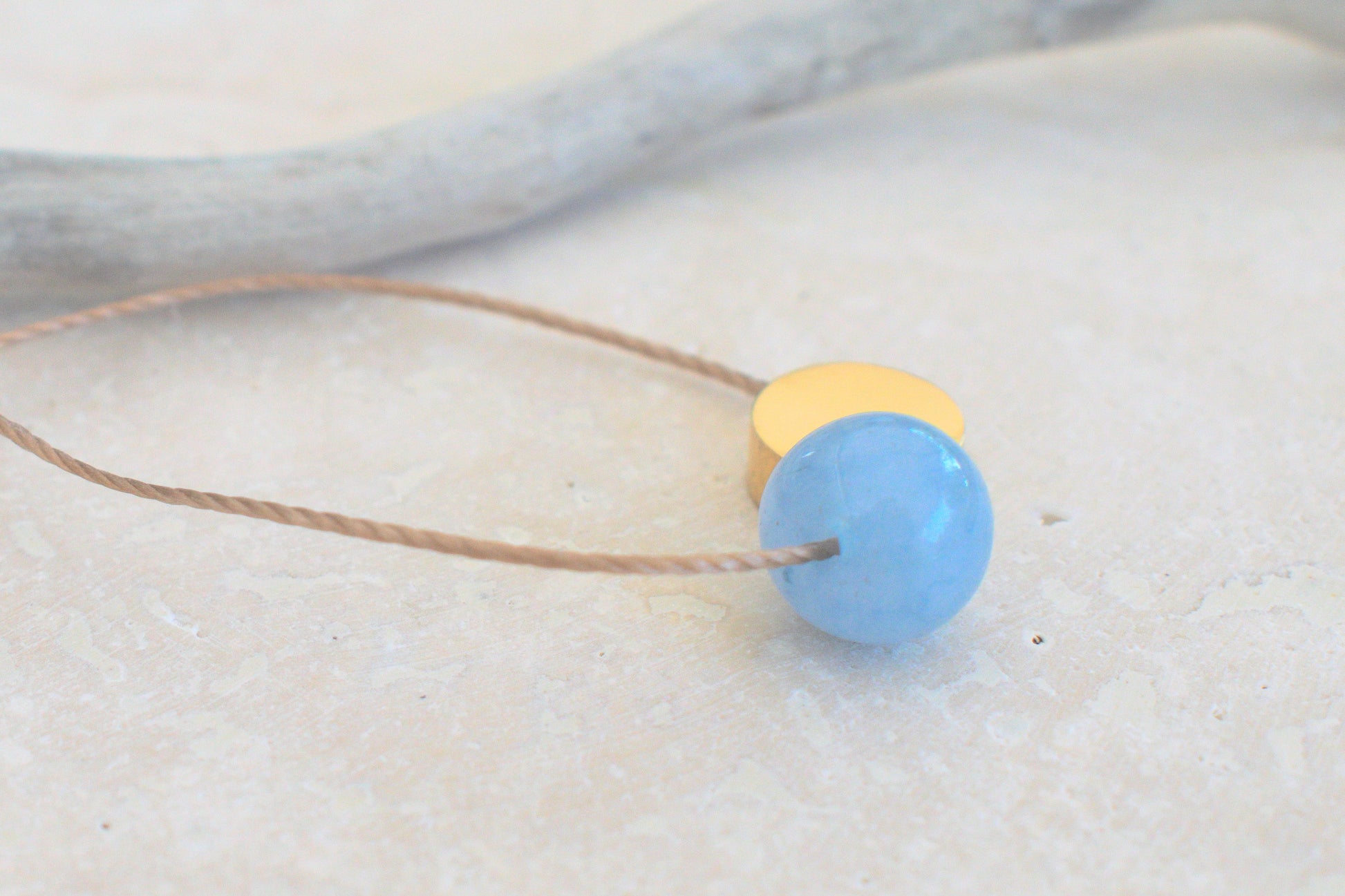 Dieses zarte Schmuckelement vereint natürliche Materialien mit moderner Eleganz. Auf einem feinen, braunen Nylonfaden sind zwei besondere Akzente arrangiert: eine himmelblaue Edelstein Perle aus Aquamarin sowie eine flache, runde Perle aus goldfarbenem Edelstahl.