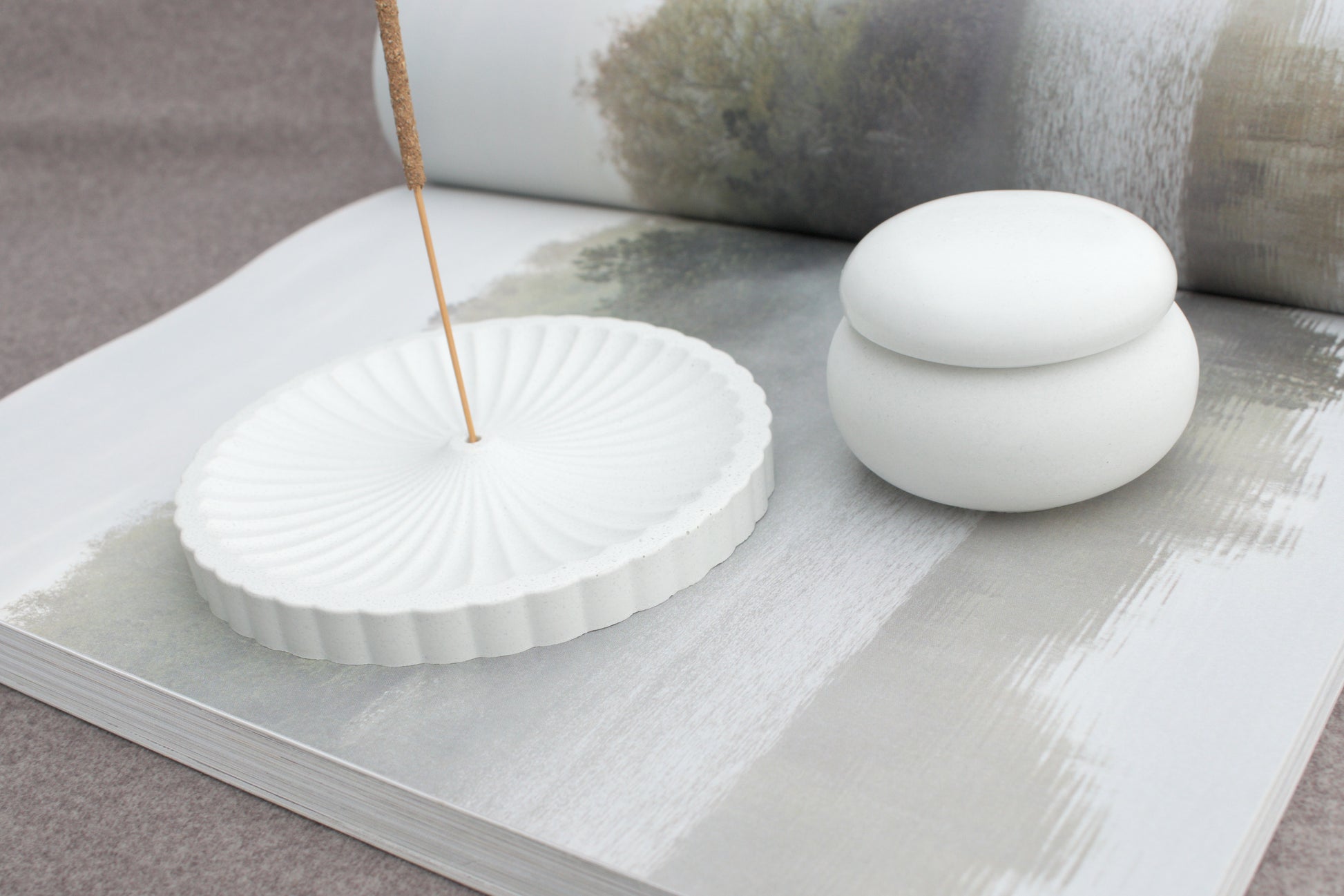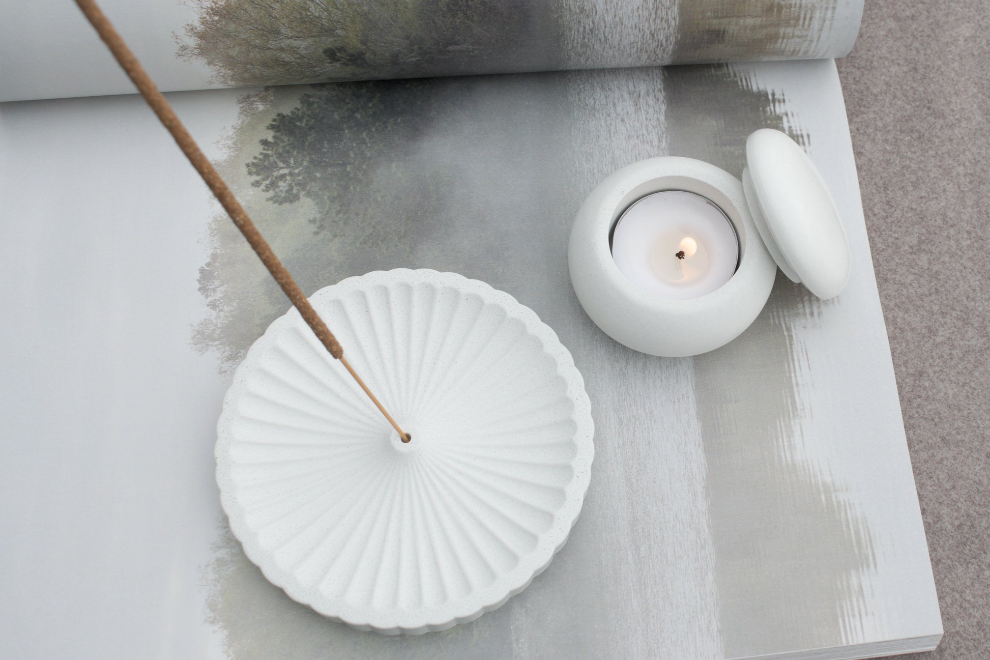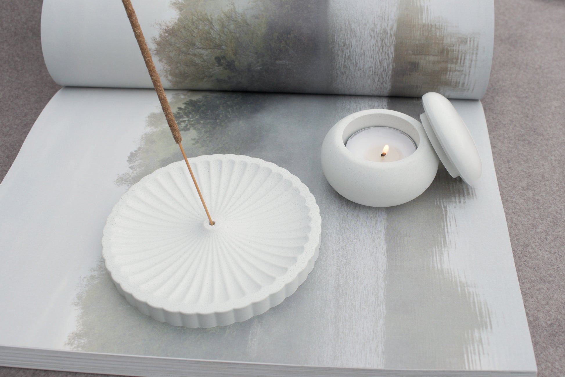 Set aus Räucherstäbchenhalter und Teelichthalter aus weißem Beton – Hygge & Spiritualität