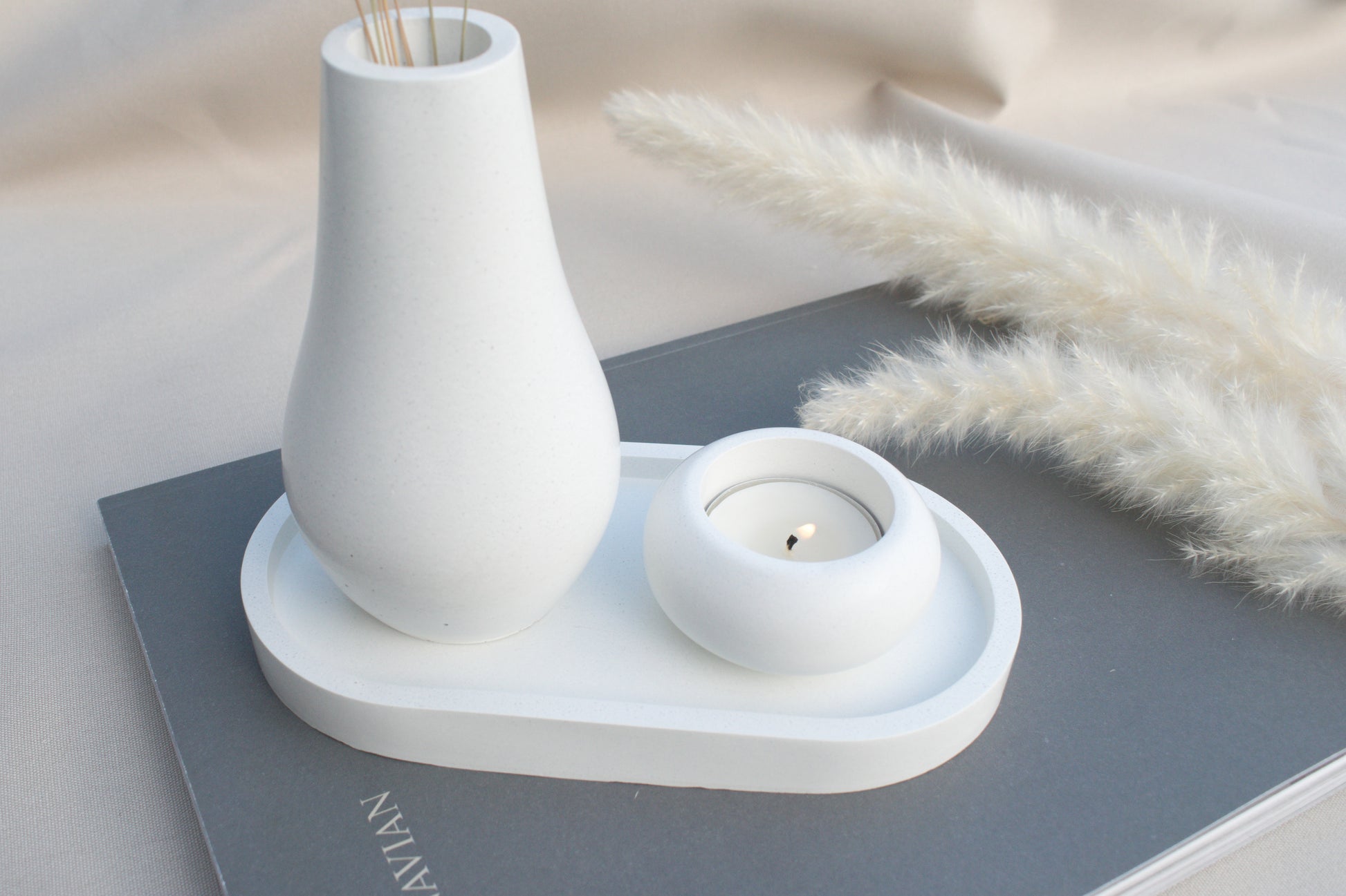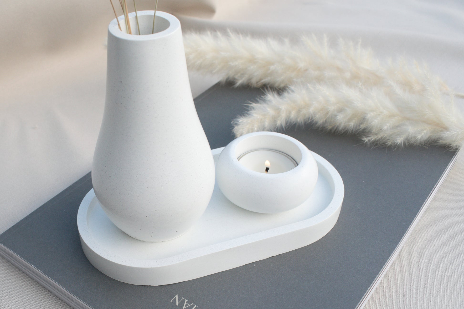Set aus weißem Beton mit Tablett, Vase und Teelichthalter, minimalistische Deko im Industrial und Skandi Style