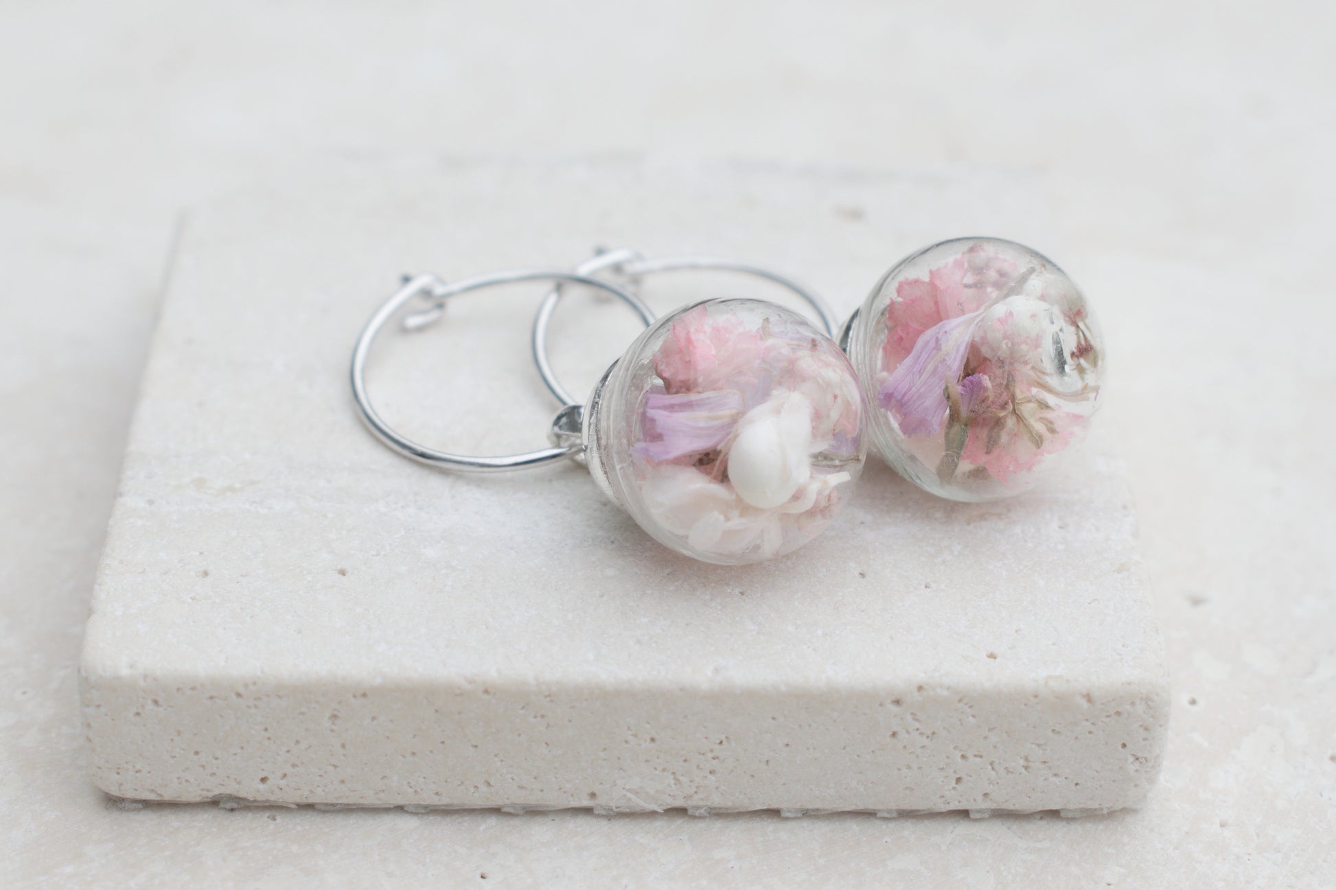 Jede Perle ist ein kleines Kunstwerk. In ihr befinden sich sorgfältig ausgewählte, echte Blüten, die dauerhaft konserviert wurden. Dadurch ist jedes Paar Ohrringe ein Unikat und bringt die Schönheit der Natur direkt in deinen Alltag.