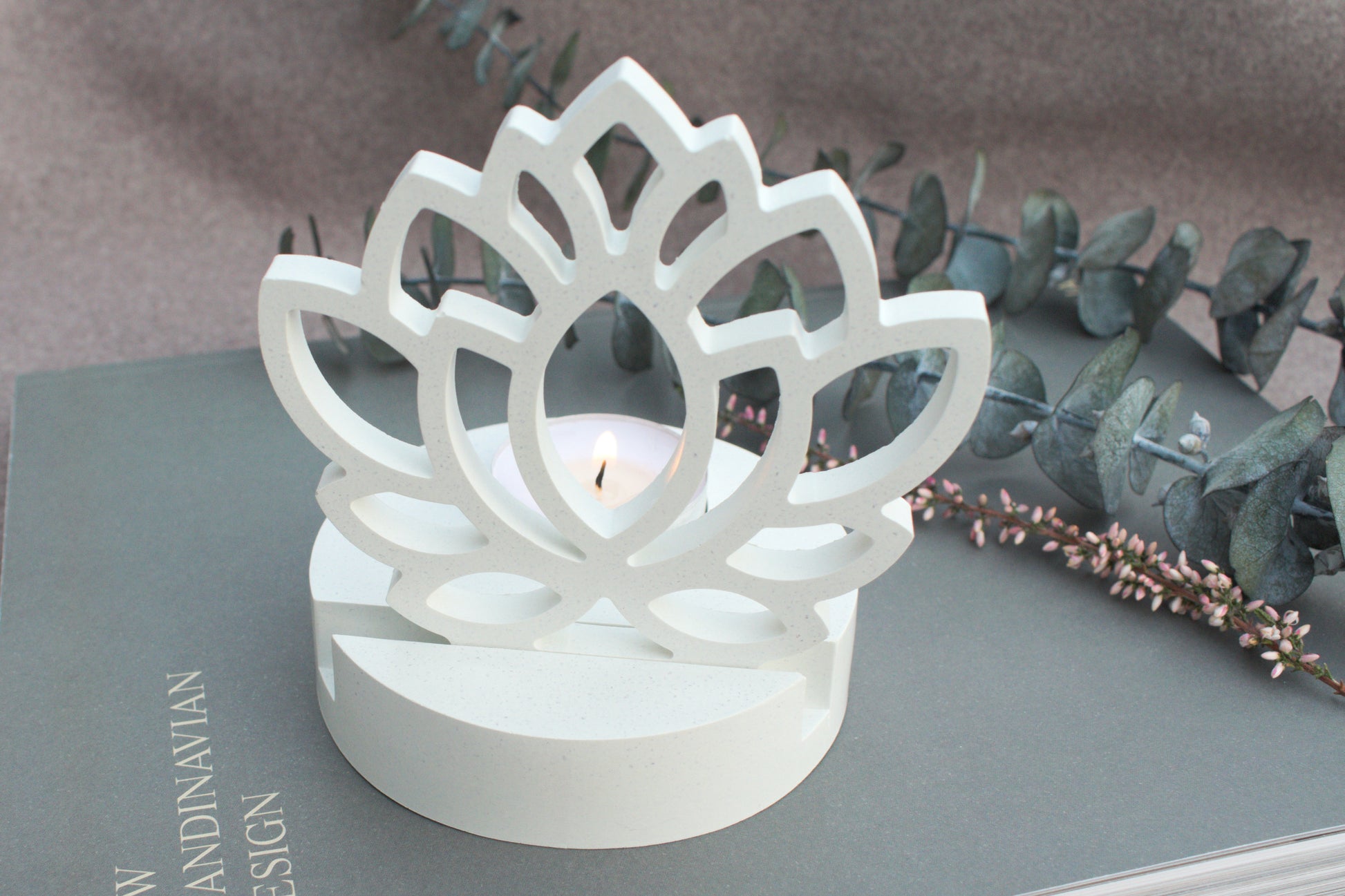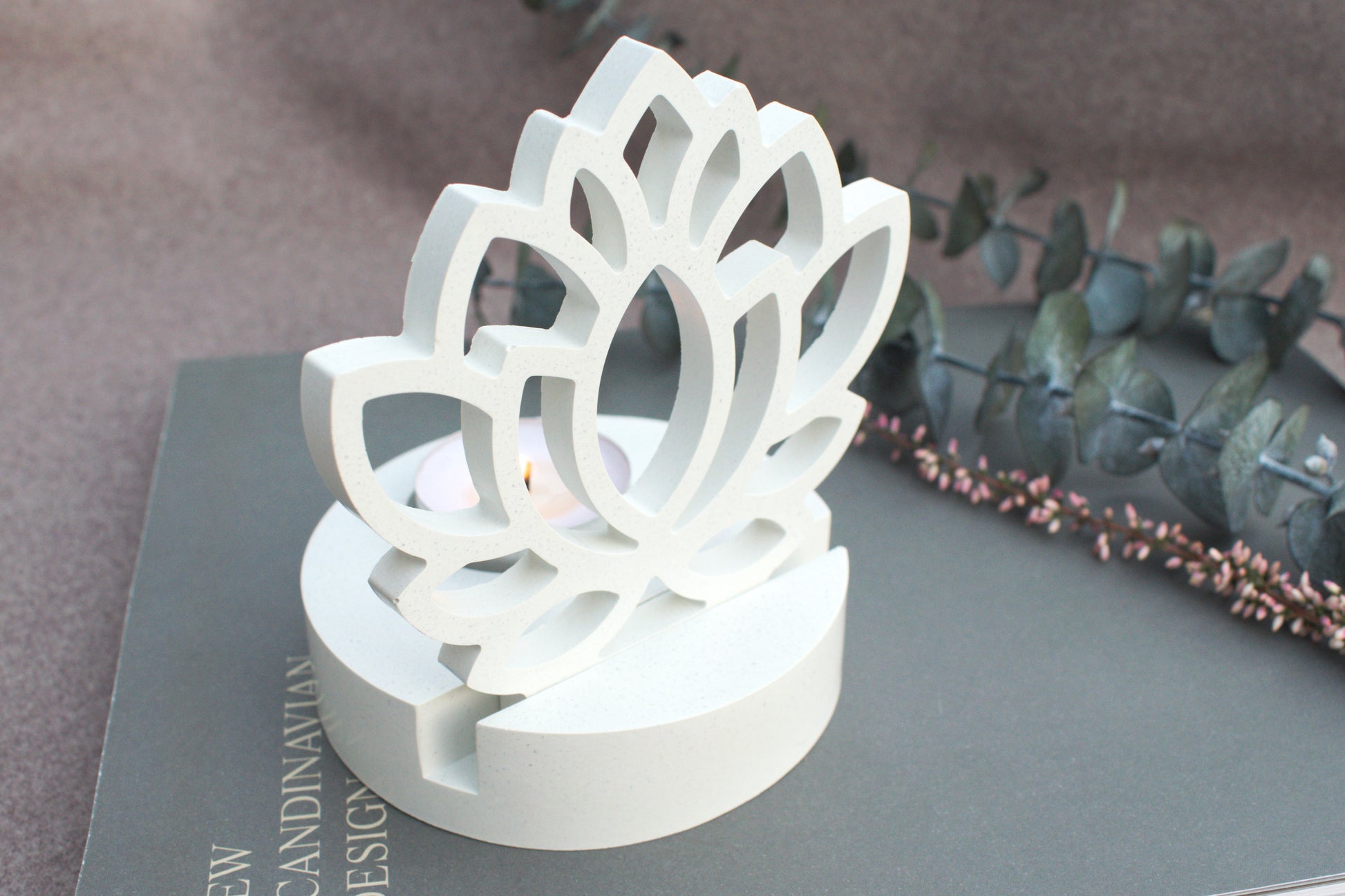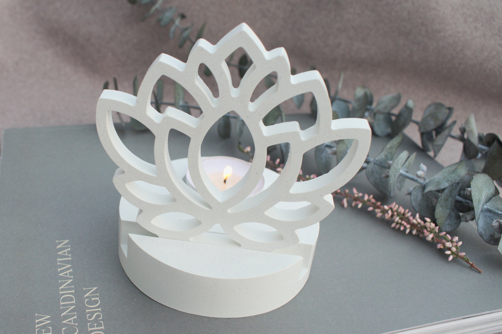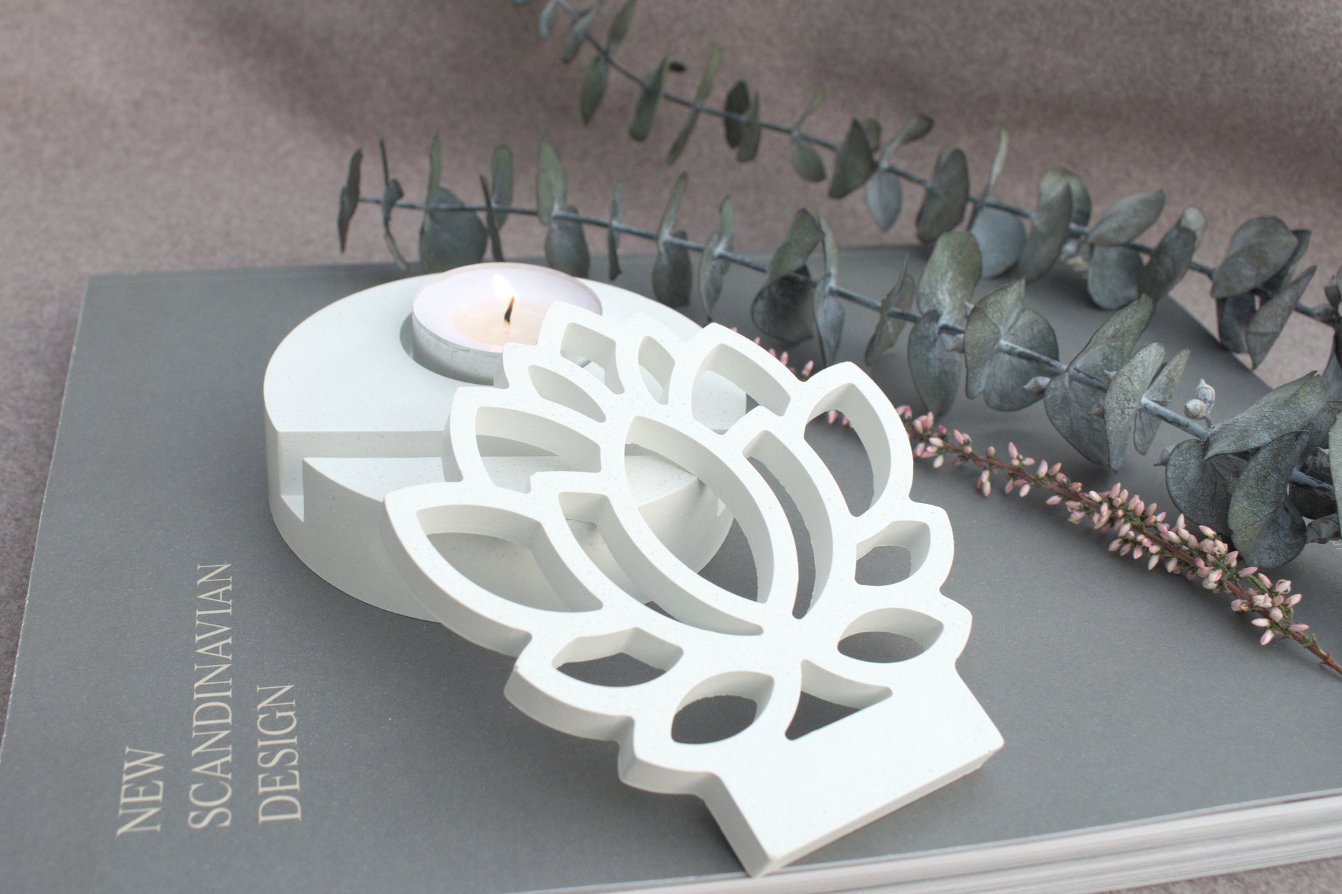 Skandi Kerzenhalter aus weißem Beton im minimalisatisches Design mit sanfter, wohltuender Atmosphäre für Yoga