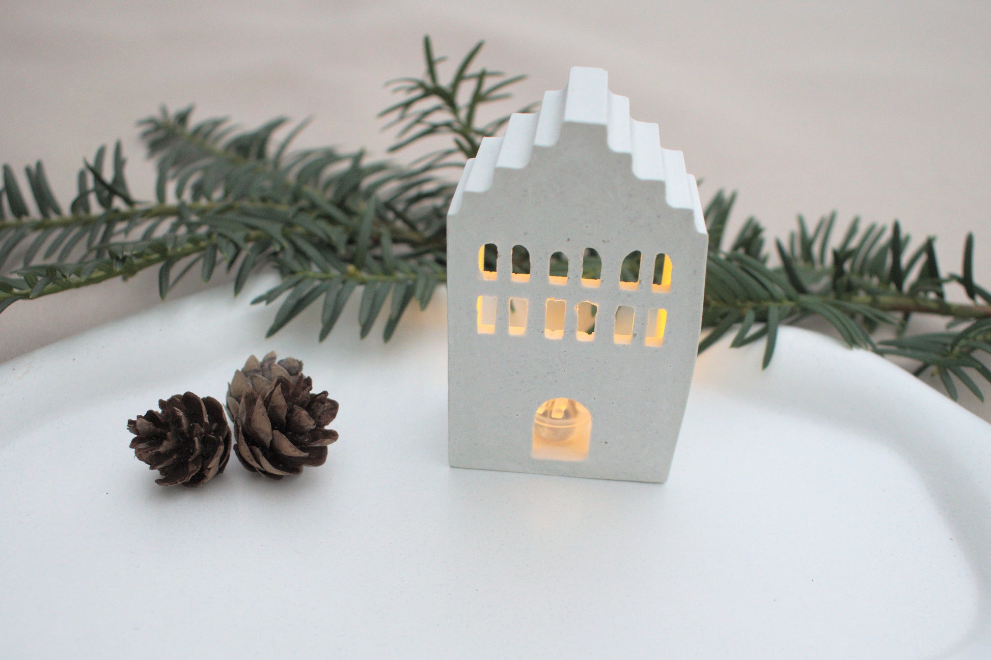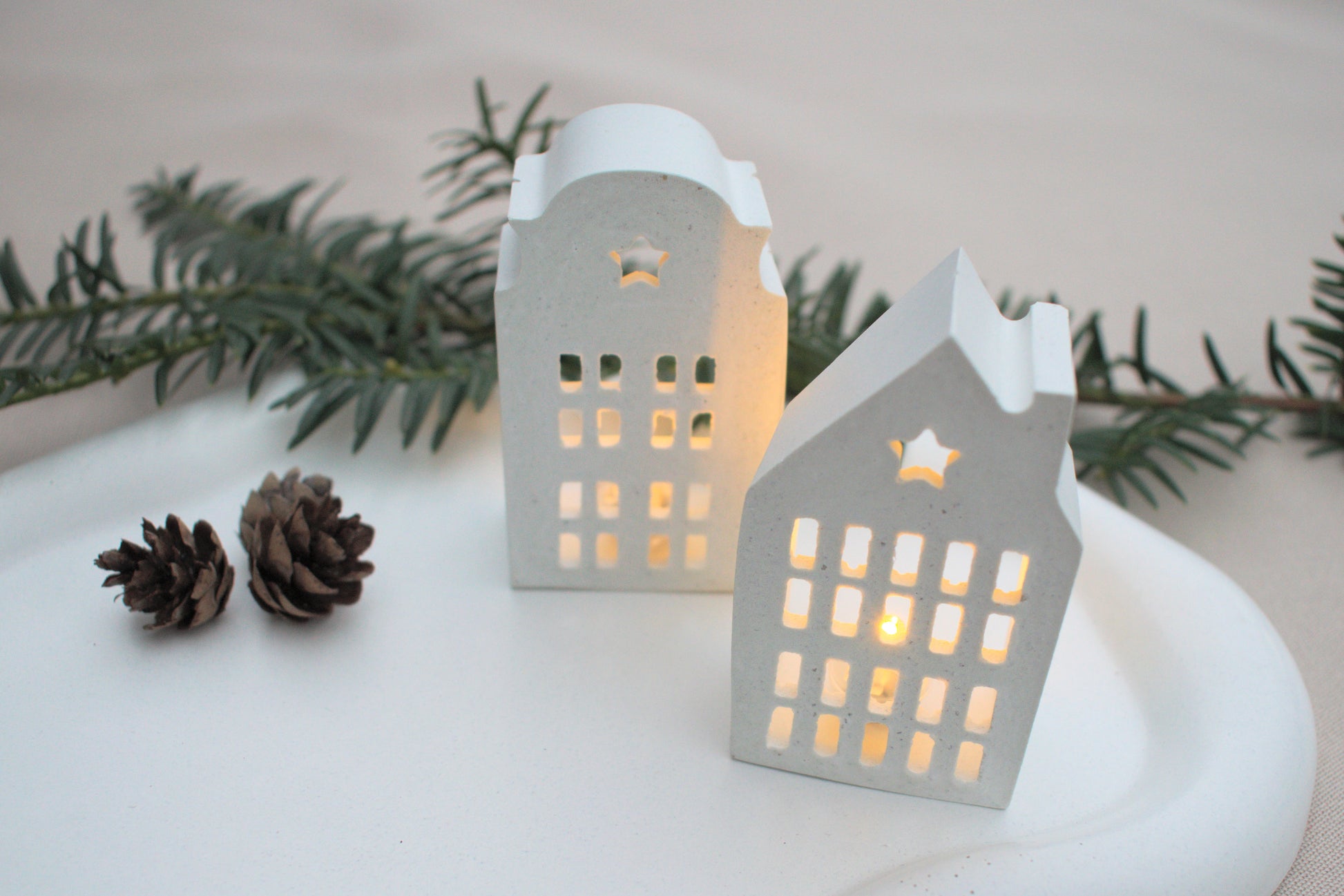 Skandi mini Lichthäuser Set aus weißem Beton für ein nordisches hygge zu Hause mit Licht