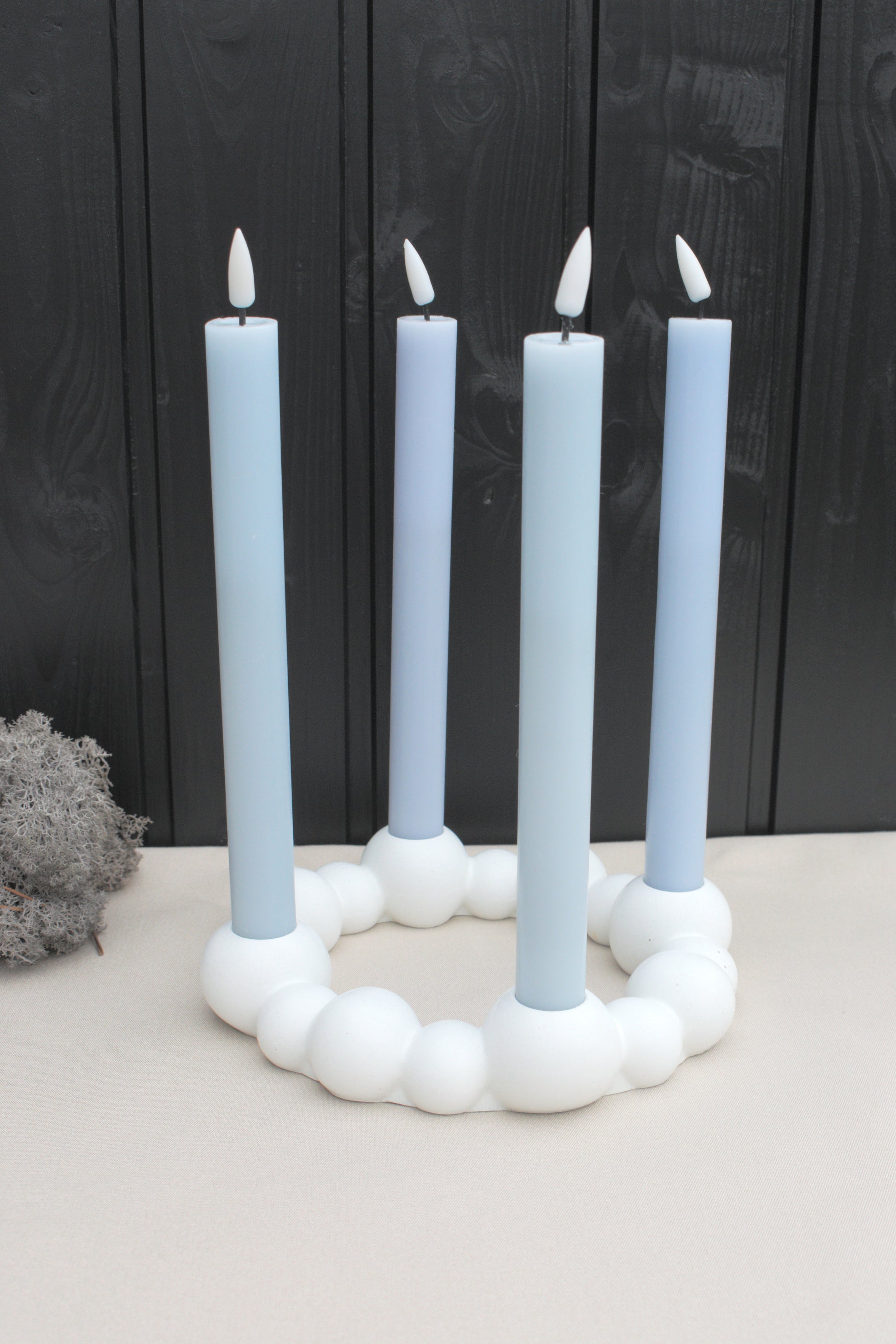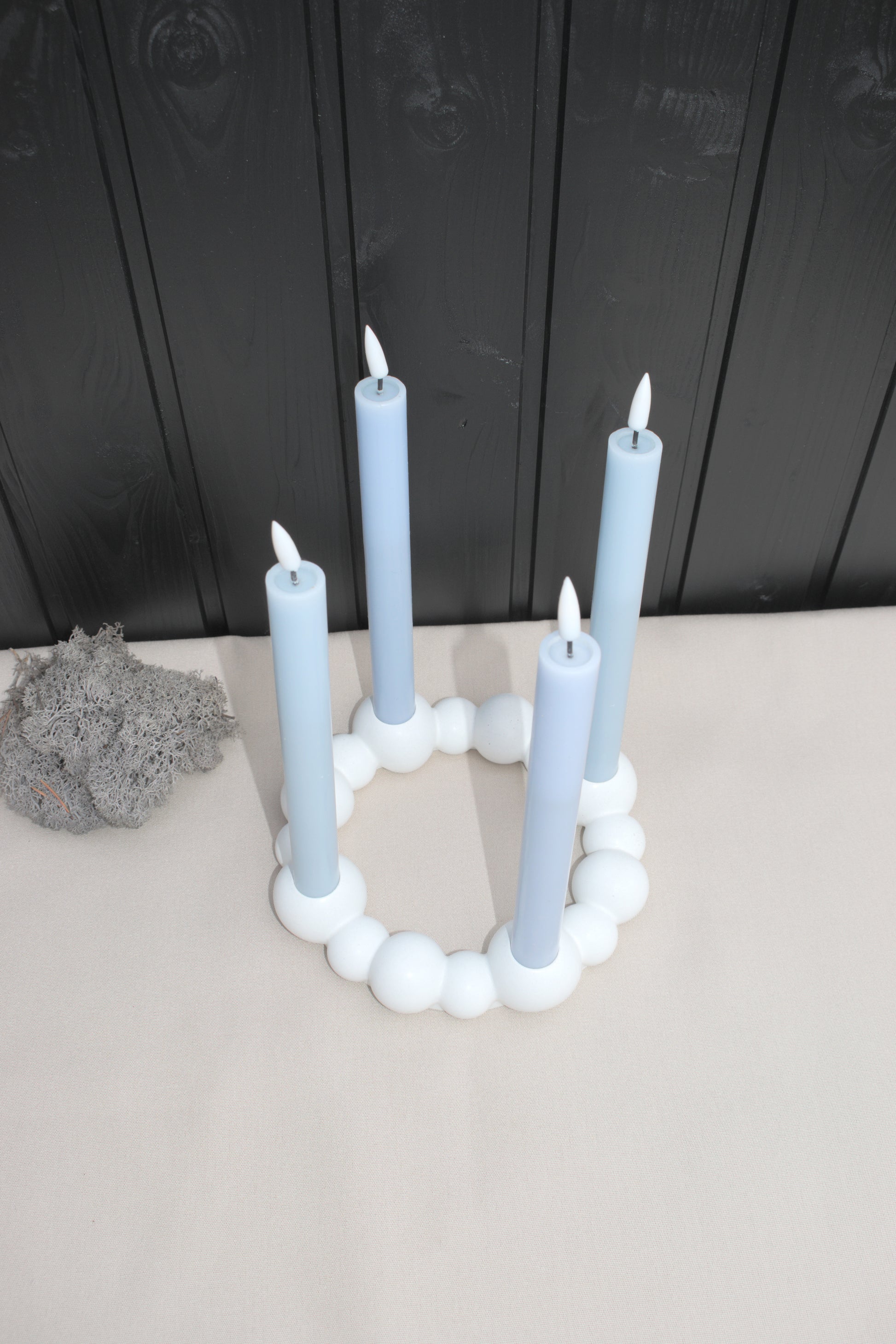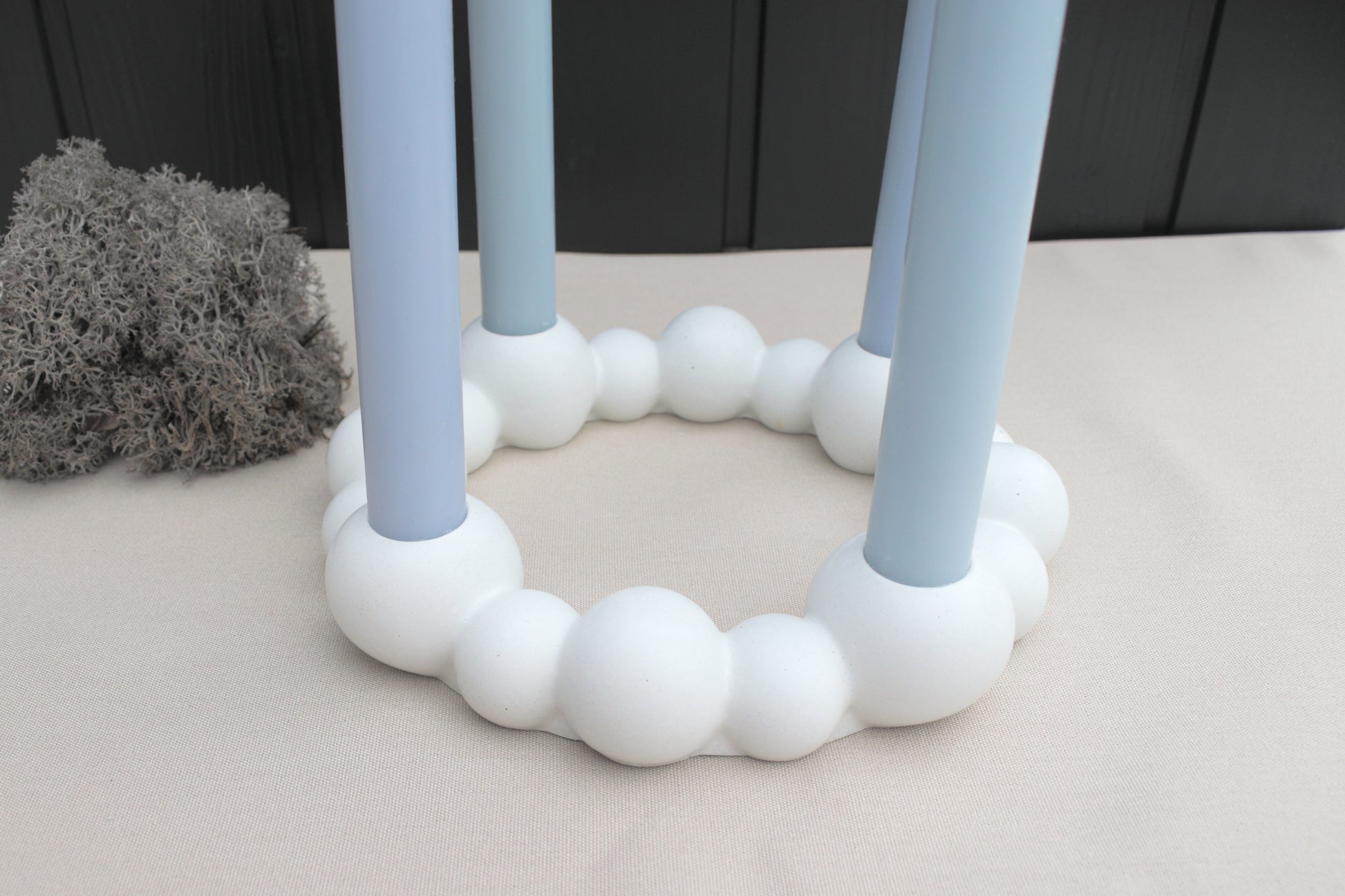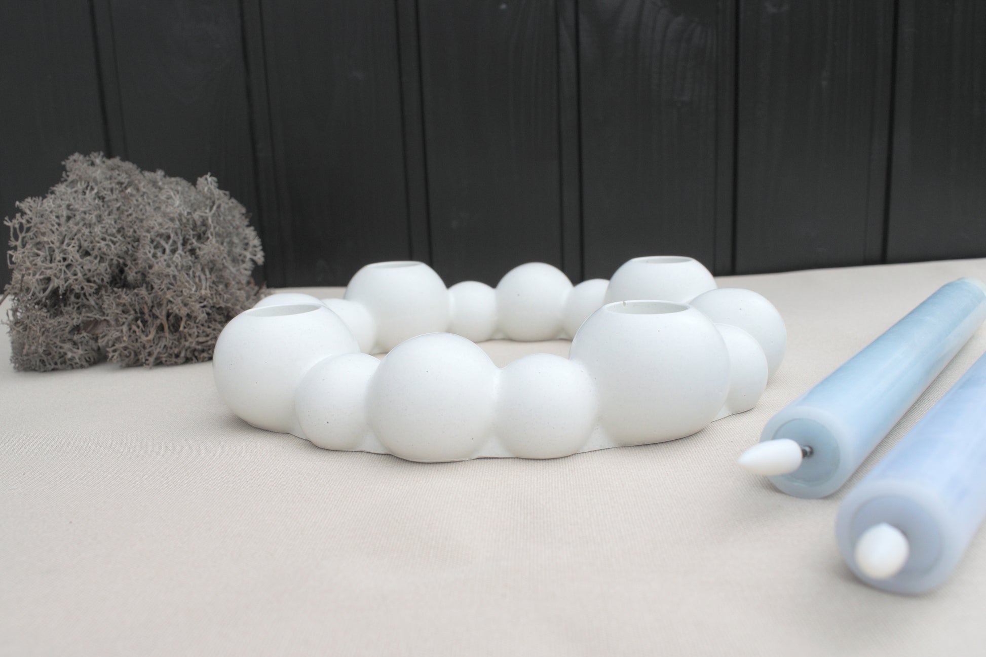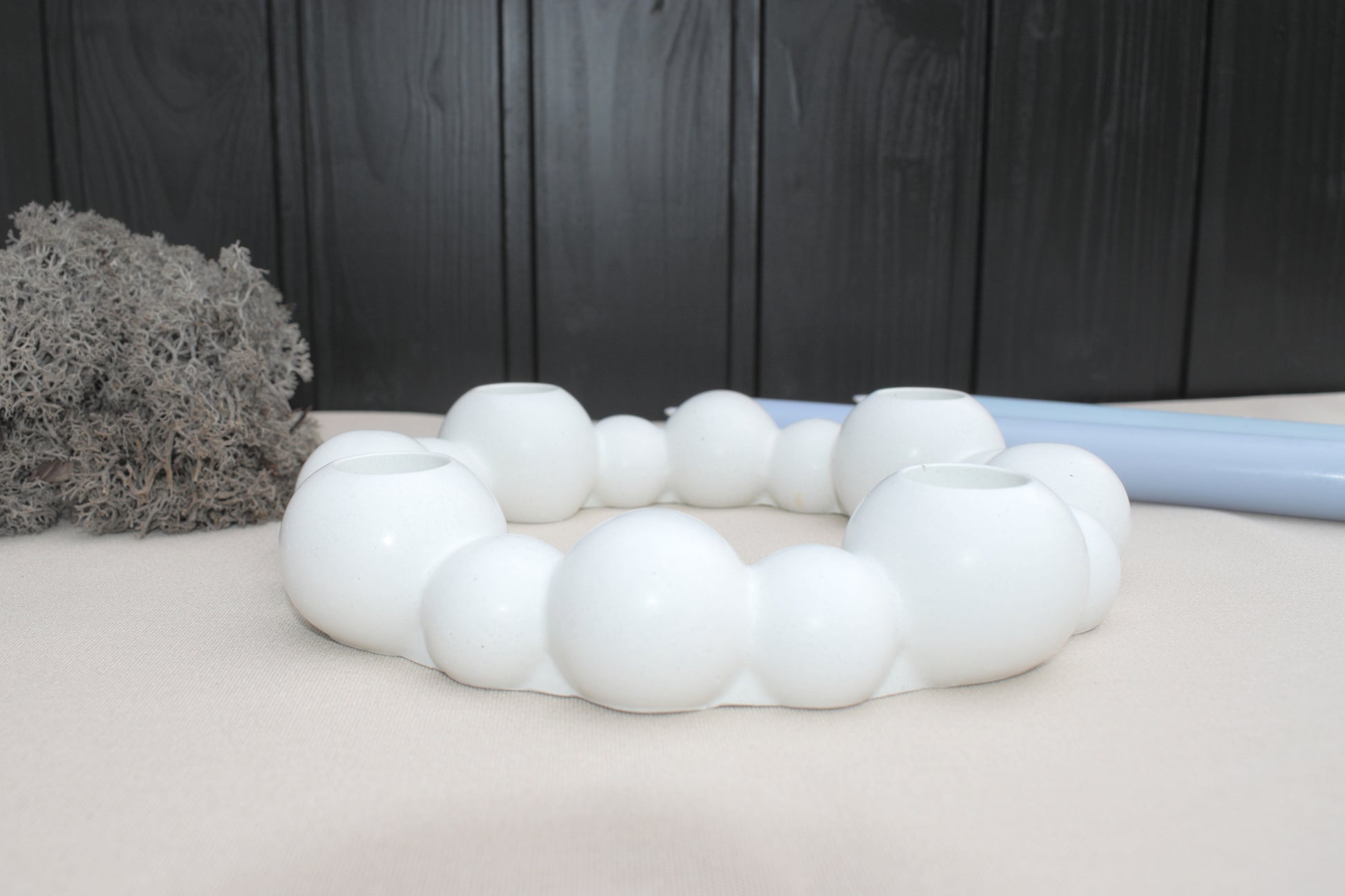 Dieser elegante, weiße Kerzenhalter vereint skandinavisches Design mit winterlichem Charme. Seine organische Form erinnert an aneinandergereihte Schneebälle und schafft so eine verspielte, zugleich stilvolle Silhouette. Die matte Oberfläche in weiß unterstreicht die klare, nordische Ästhetik und fügt sich harmonisch in moderne wie klassische Interieurs ein.