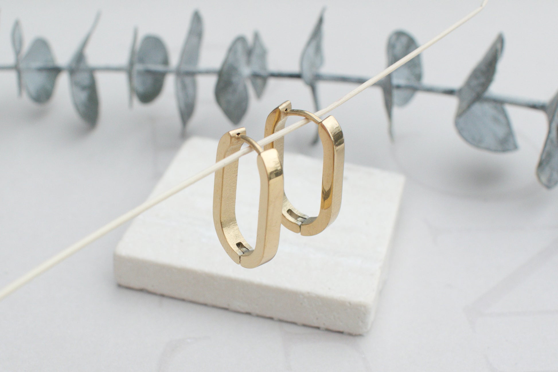 Vergoldete Hängeohrringe aus Edelstahl – rechteckig und geometrisch im Industrial Style.